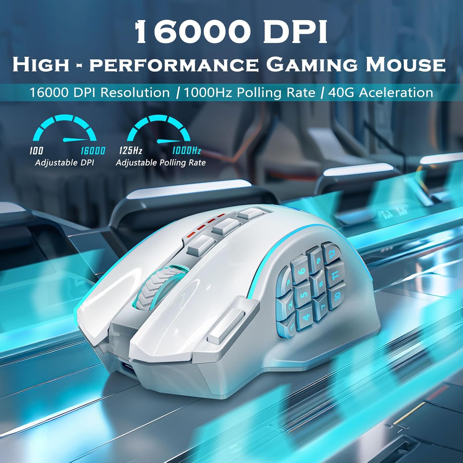 - 【High-performance Gaming Mouse】UP 16000 DPI provides high sensitivity and smoothing movements. Adjustable DPI(100-16000) and Polling Rate(125Hz-1000Hz) ensure this professional gaming mouse is suitable for gaming or daily work. Attached the 40G Acceleration gives you a greater edge over your competition.