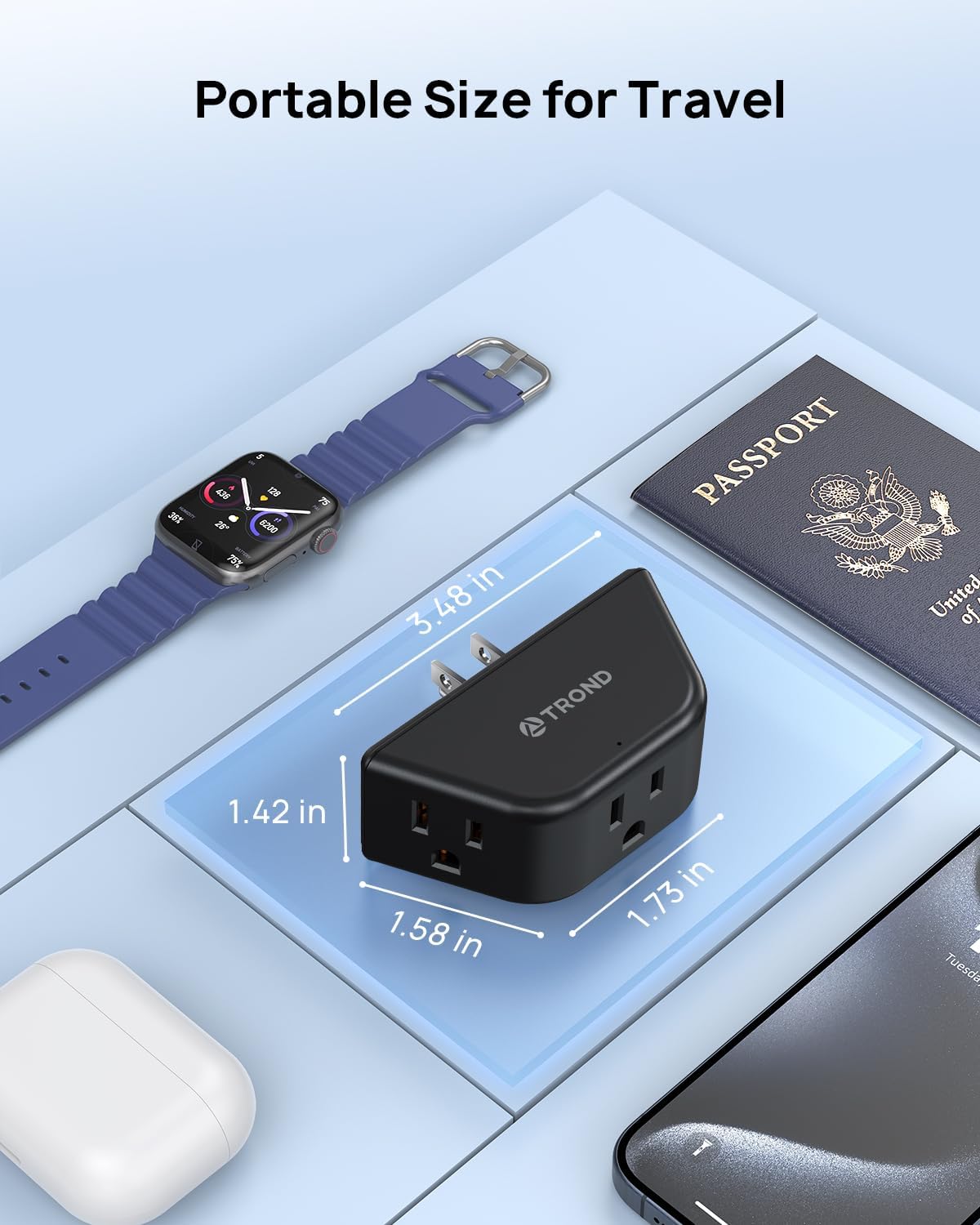 TROND Multi Plug Outlet 3 Pack - Wall Extender with 3-Prong Grounded Sockets, 3 Way Angled Outlet Adapter, Cruise Essentials, Expander for Travel, Home, Hotel, Dorm Room, Black