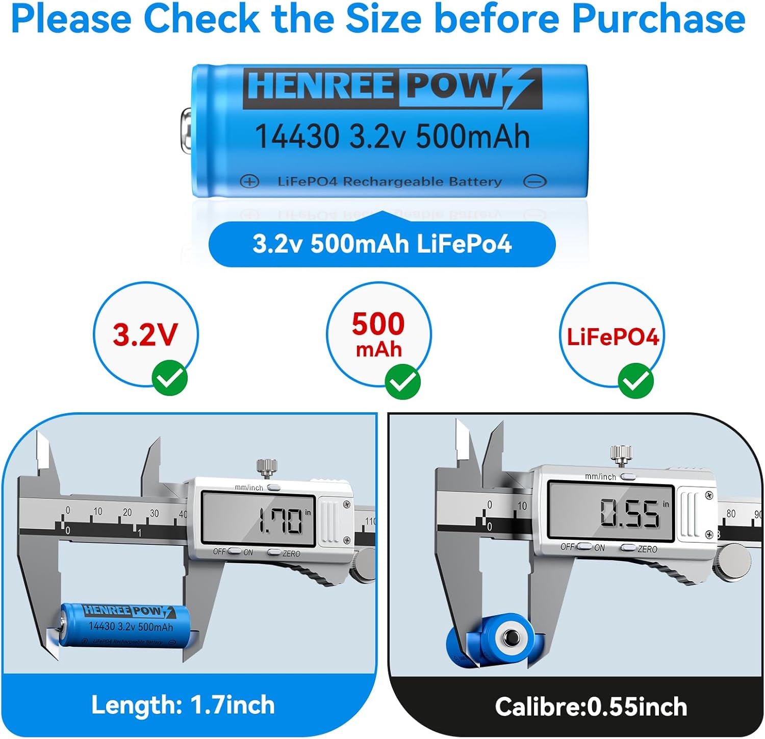 Henreepow LiFePo4 Battery 14430, 3.2v Rechargeable Solar Batteries, 500mAh LiFePo4 Battery for Outdoor Solar Garden Lights, Shaver, Flashlight, Toothbrush (6pack-Not AA Size)