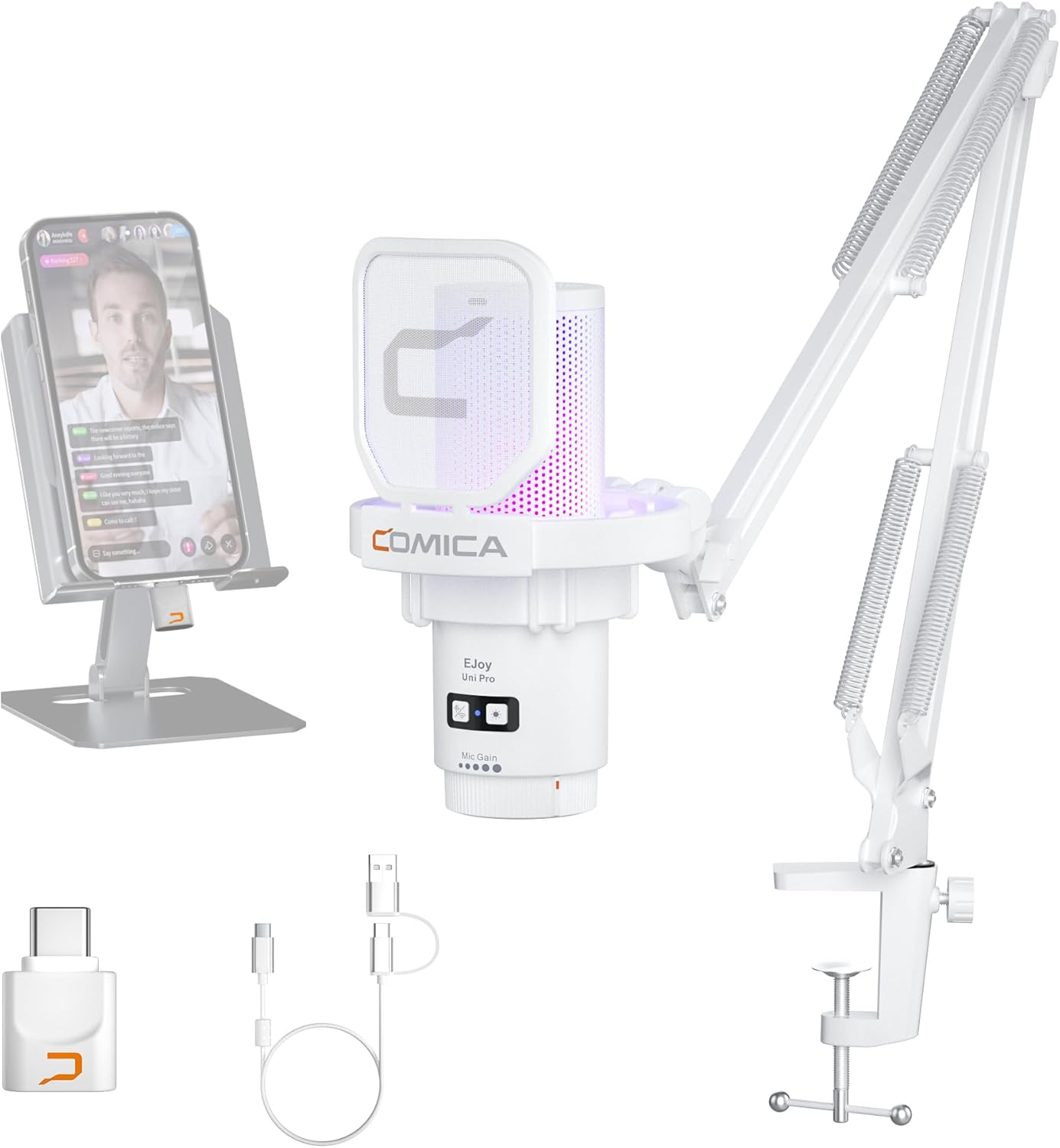 Comica EJoy Uni Pro Wireless USB Condenser Gaming for PC, PS4, PS5, USB C Phone and Mac, Boom Arm RGB Computer Mic for Twitch, Streaming, Podcasting, Noise Cancellation Mic with Mute, Gain, Monitoring