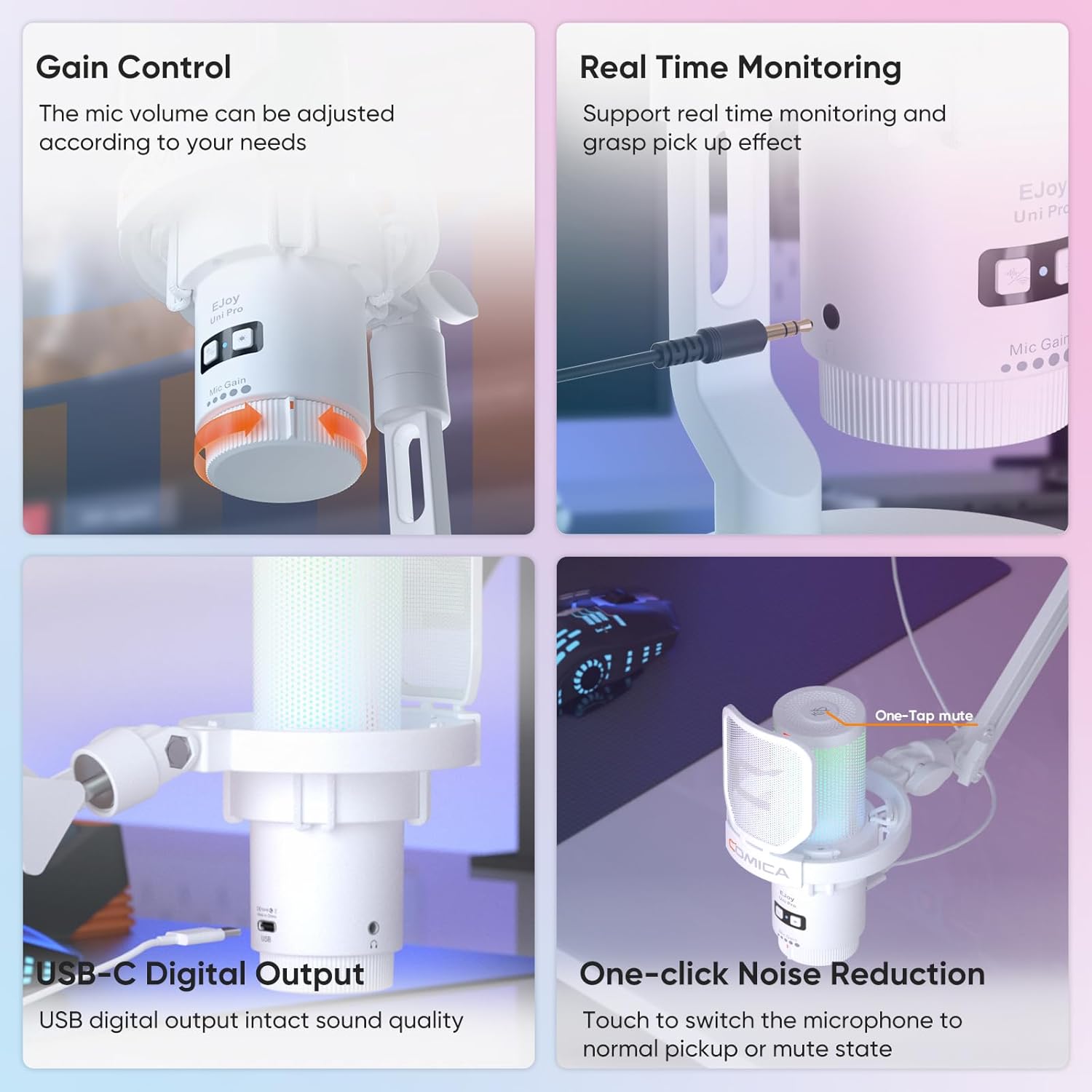- ăPlug and Play, Compatible With MOST OSă Comica Ejoy Uni Pro is compatible with a wide range of devices, including PS4/5, Windows Mac OS PC Computer Laptop, iPhone, iPad, Tablet, Type C devices, and Android. This gaming microphone USB mic offers seamless compatibility with your favorite gaming devices.