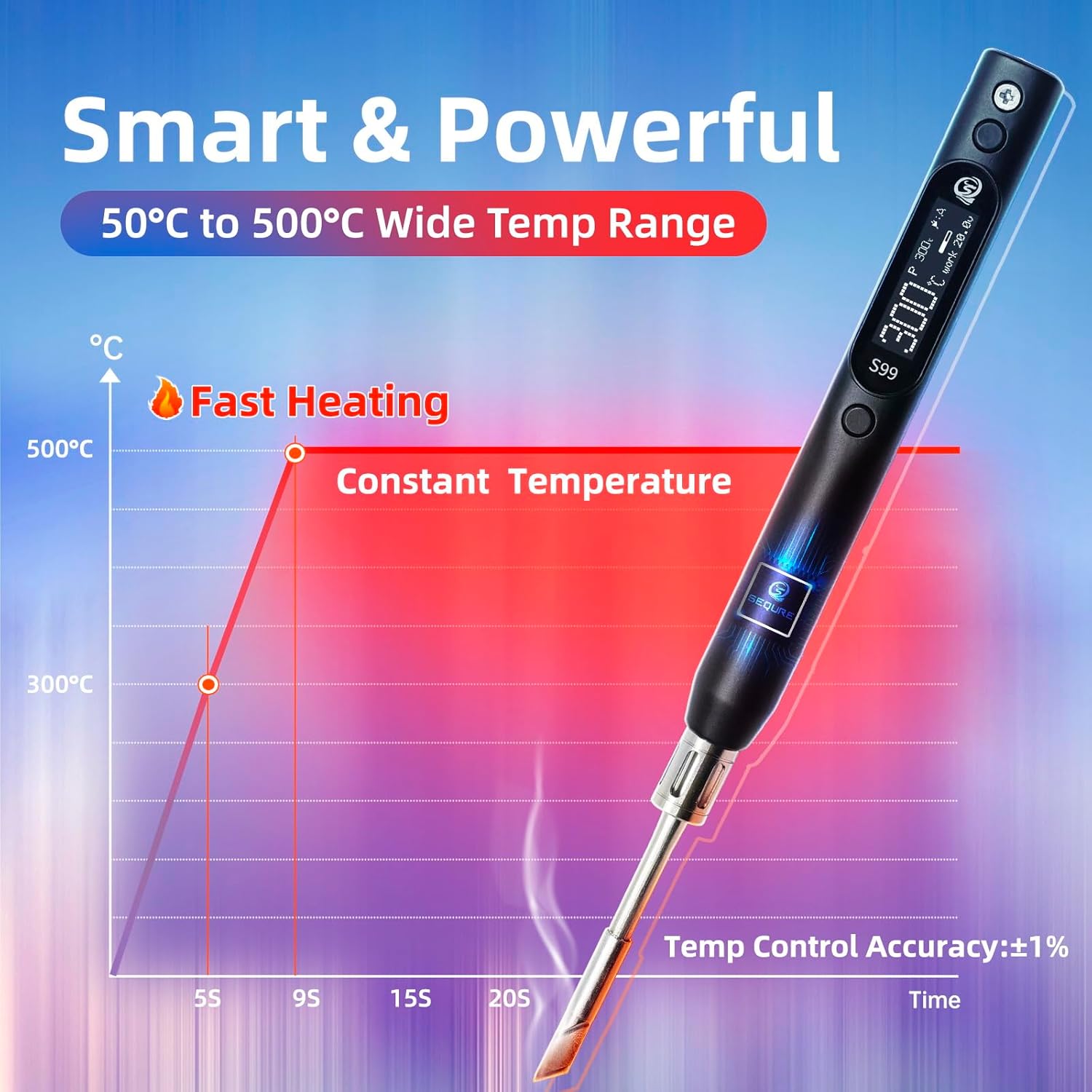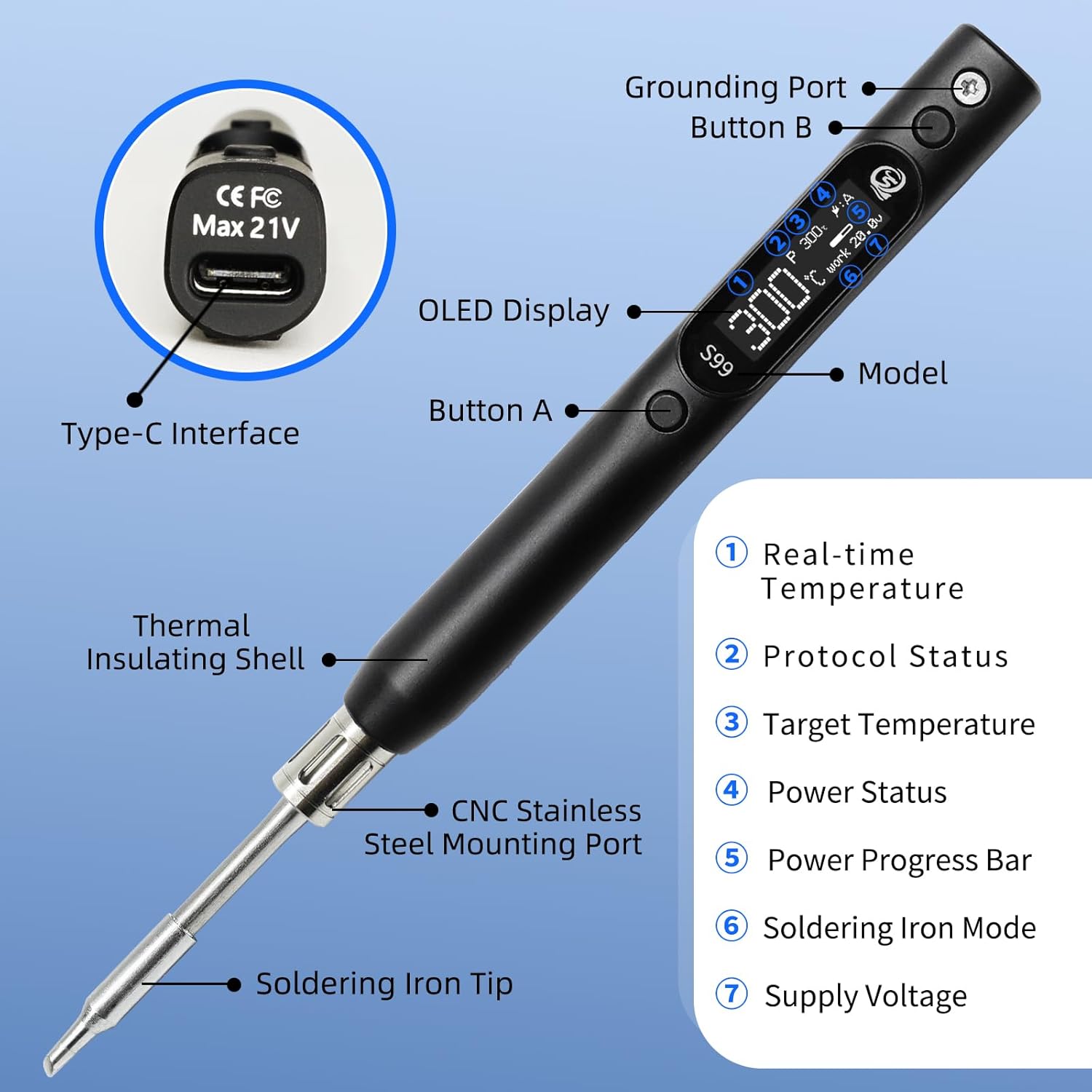 - 【Support More Protocols】 SEQURE S99 soldering iron kit updates the power supply mode. USB-C supports DC/PD/QC/PPS protocols.Can be directly powered by laptop power supply, lipo battery, etc. Ideal for indoor & outdoor use!