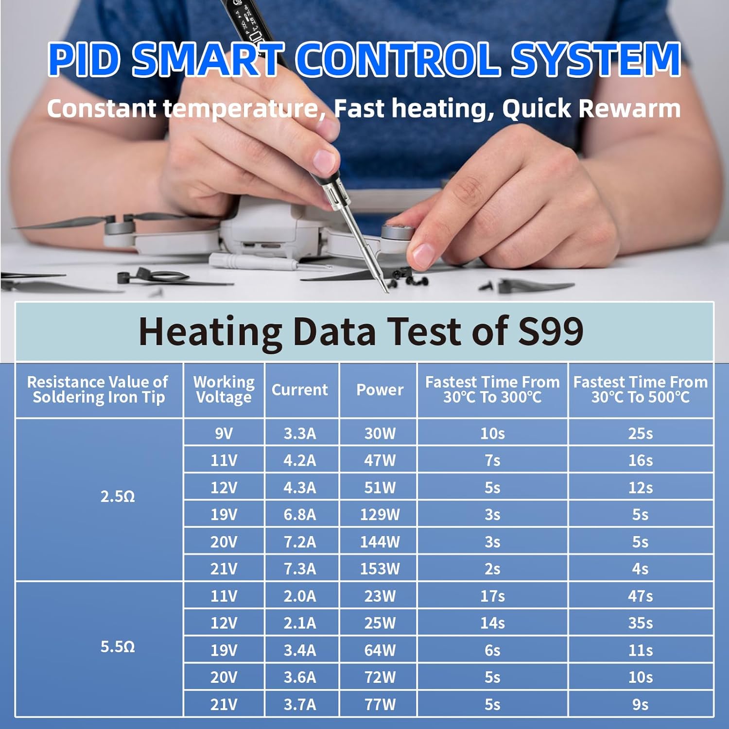 - 【Wide Voltage & Temperature】 S99 soldering kit supports wide input voltage from DC9V-21V(2.5Ω), DC11-21V(5.5Ω). The maximum power up to 150W(2.5Ω), 75W(5.5Ω). With HD OLED display, the temperature can be accurately and easily adjusted from 122°F to 932°F (50°C-500°C).