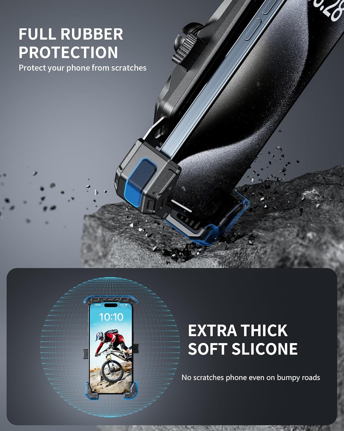 - Shockproof and Camera Protection: The bike phone holder is equipped with vibration dampener to minimize impact and vibration on your phone and camera during rides. The four corners of the motorcycle phone mount are covered with cushioning rubber pads that fully wrap your phone, preventing scratches and vibrations. The non-contact design between our bike phone holder and your phone camera prevents pressure and scratches on the camera during rides, ensuring worry-free riding