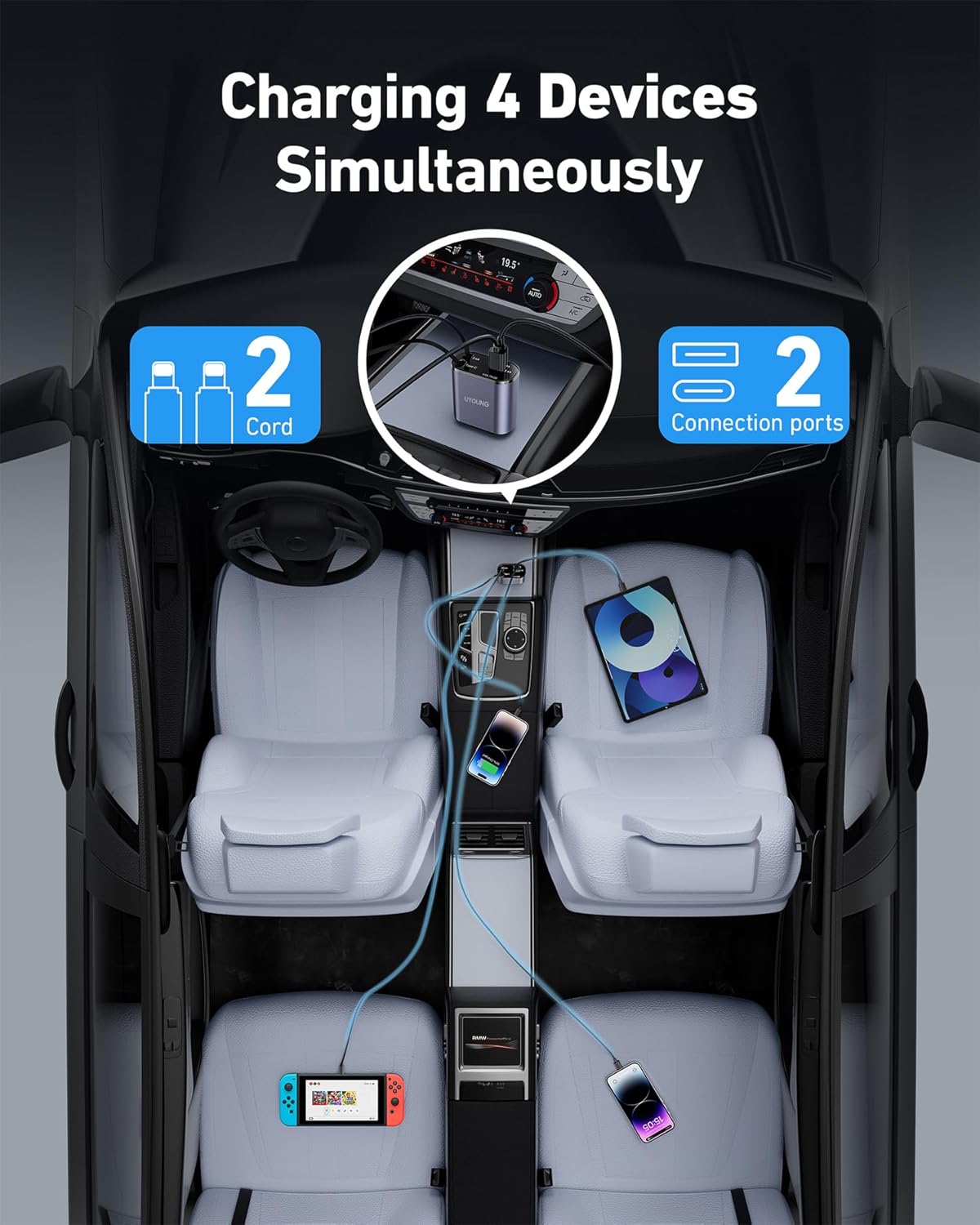- Included Components : 1 Retractable Car Charger, 2 Retractable Lightning Cables (31.5 inches max length), and 2 USB Ports