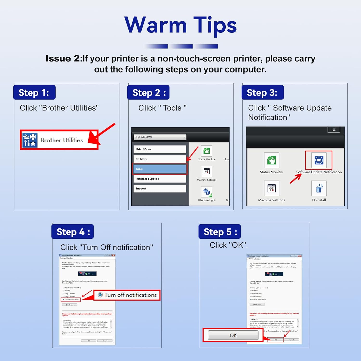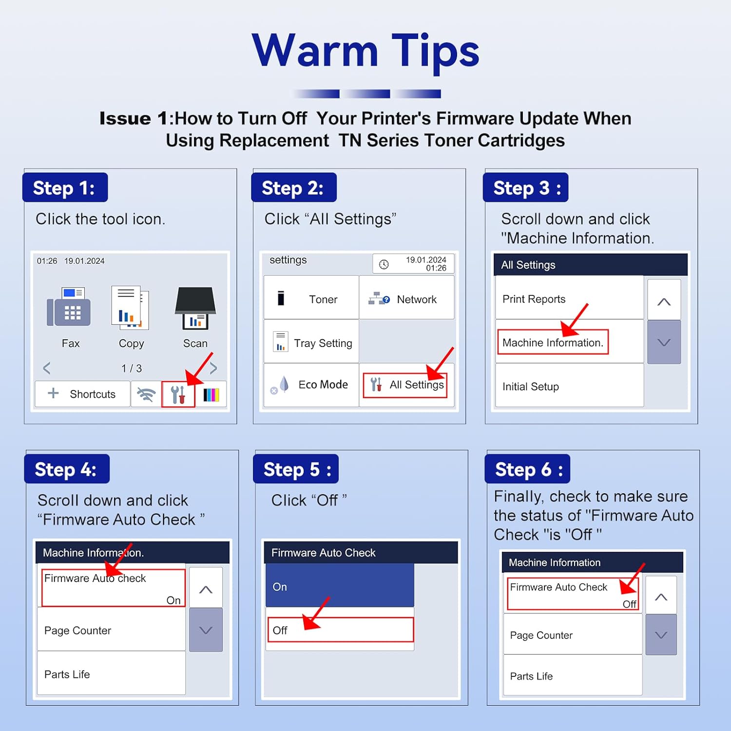 - Using tips for TN830XL “Non Brother Toner” issue:when cartridge is first t installed,the printer screen will display”NON BOTER TONER”.Please click “YES”for normal use.Note:If you click “NO””’mistakenly,it will be inoperative.You can restart and select “YES””on the following screen for a normal operation