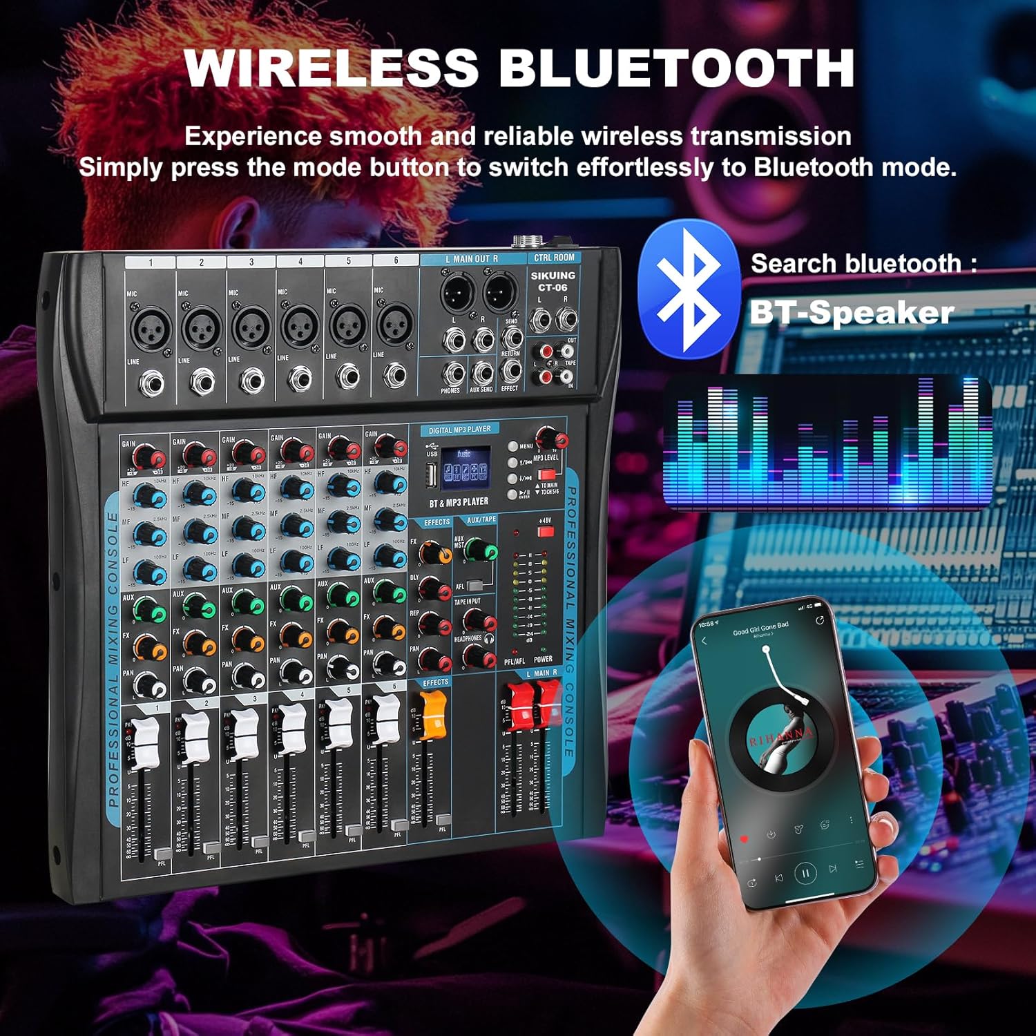 - 【6 Channel Audio Mixer】This advanced audio mixer is made for DJs and music production. With 6 mic inputs, gold-plated XLR and balanced line input jacks, support for balanced XLR inputs, and the option of a built-in 16DSP sound processor, the dj mixer board also features a headphone output jack for private monitoring.