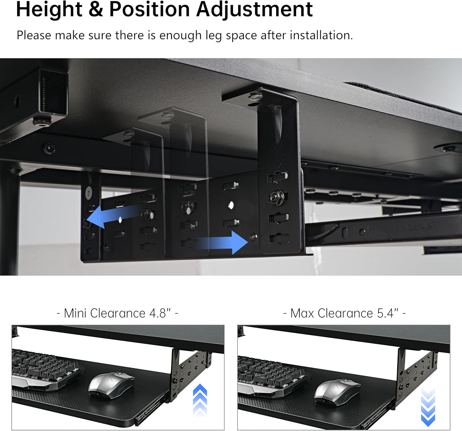 - 【Larger Size for More Comfortable Typing】: This slide out keyboard tray measures 28x11in, and the increased area allows you to place your keyboard, mouse, or other items easily. It also offers space for freedom of movement and type. You can find the perfect ergonomic setup for keyboard mouse tray, providing optimal comfort and support for your wrists and hands while typing.