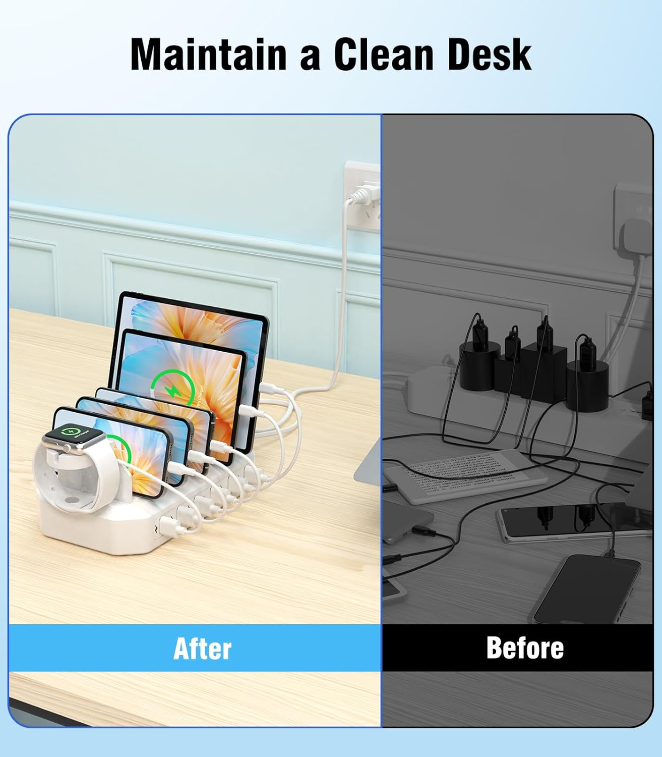 - γConvenient and TidyγThis charging station for multiple devices is designed to power several gadgets simultaneously, making it a perfect solution for eliminating the clutter of tangled cables and multiple chargers.Multi usb charging station compact design not only saves space but also provides a neat and organized appearance. Ideal for maintaining a clean and orderly workspace, home, or travel setup, this usb c charging station simplifies your life by keeping your tech essentials in one convenient, organized location