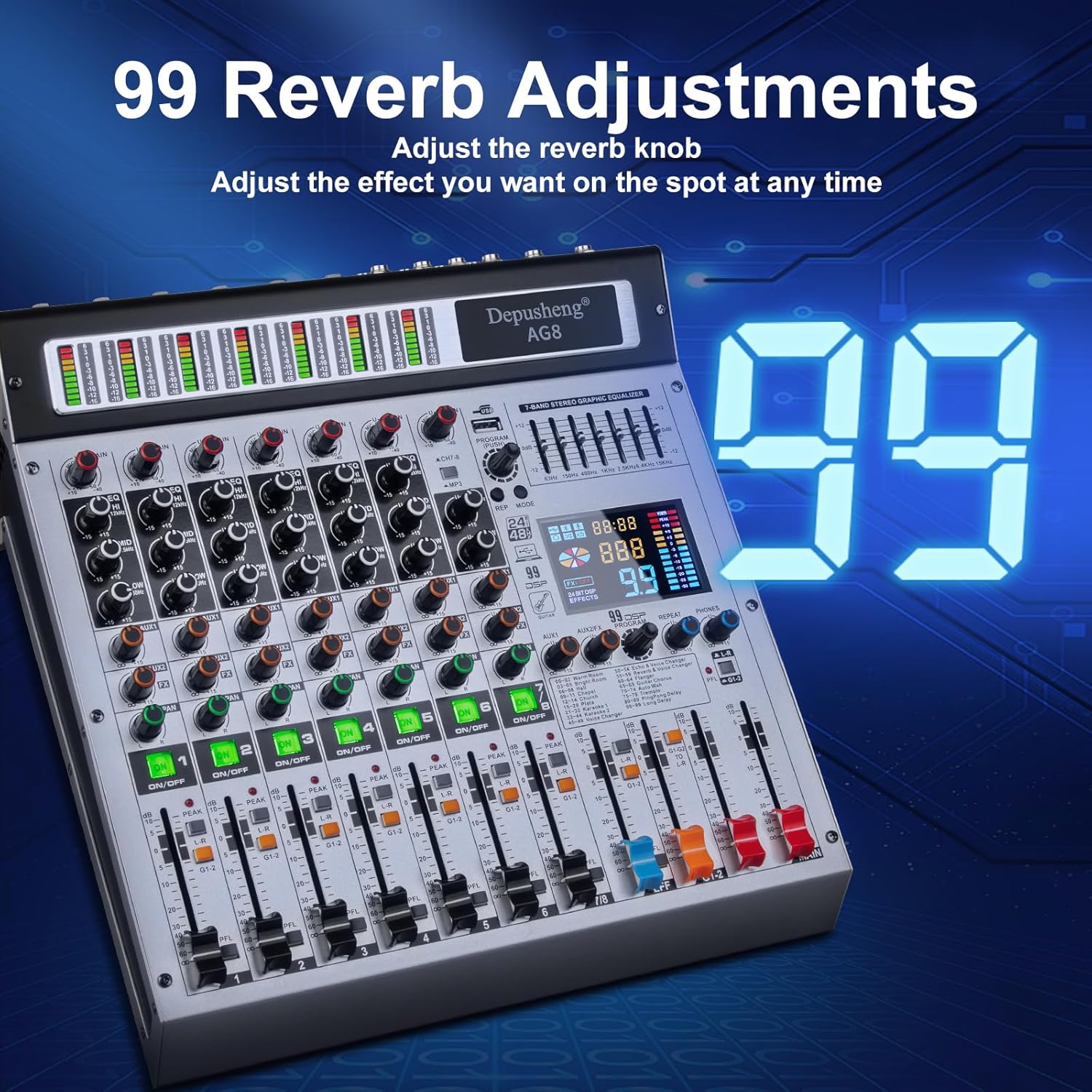 Depusheng AG8 Professional audio mixer 8 Channel with MP3 Player Source USB recording,With grouping and 2 AUX interfaces, 99DSP EFFECTfor Professional and Beginners