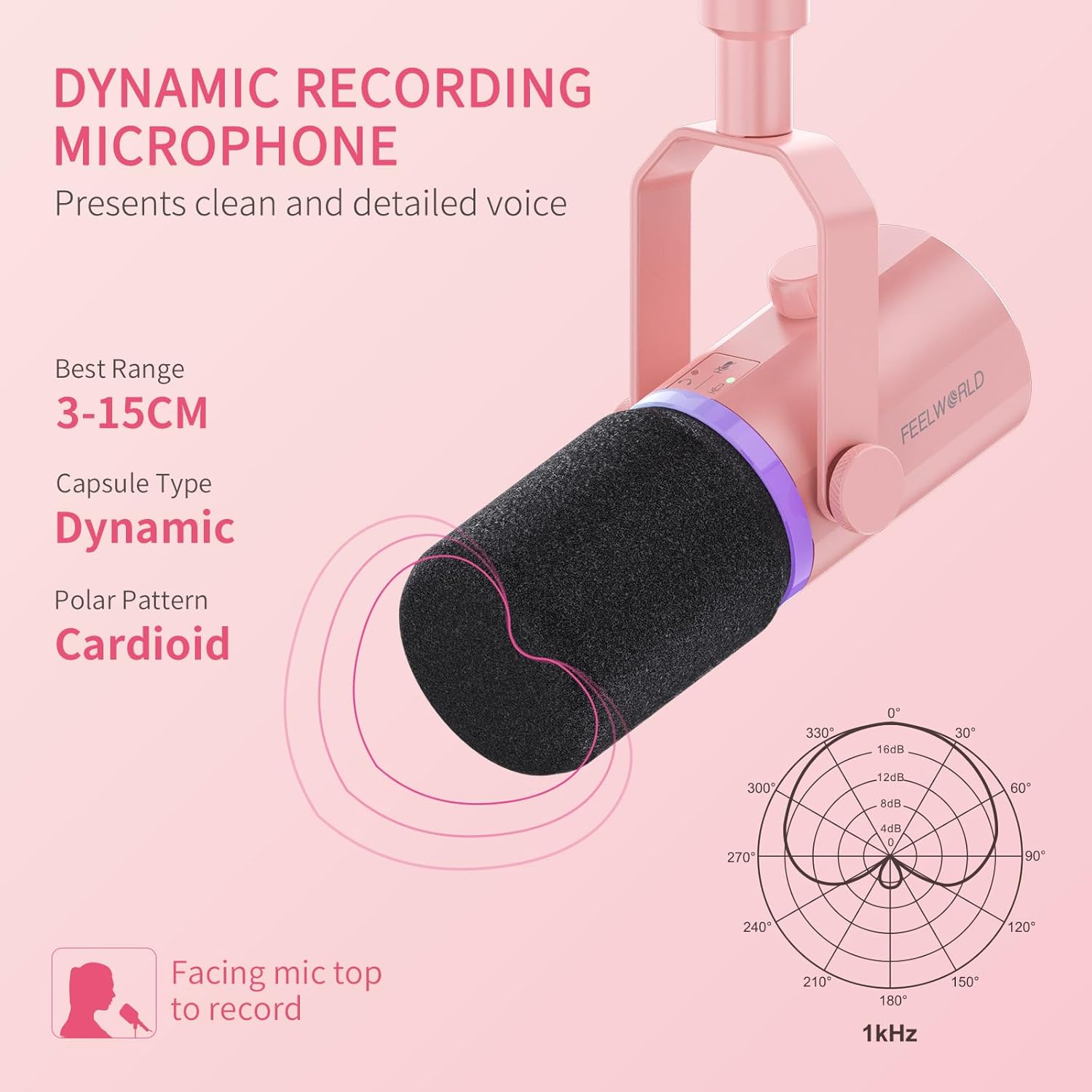 FEELWORLD PM1 XLR USB Dynamic Microphone Gifts for Podcast Recording PC Computer Gaming Live Streaming Vocal Voice-Over, Studio Metal Mic with RGB Light, Mute Button, Headphones Jack (Pink)