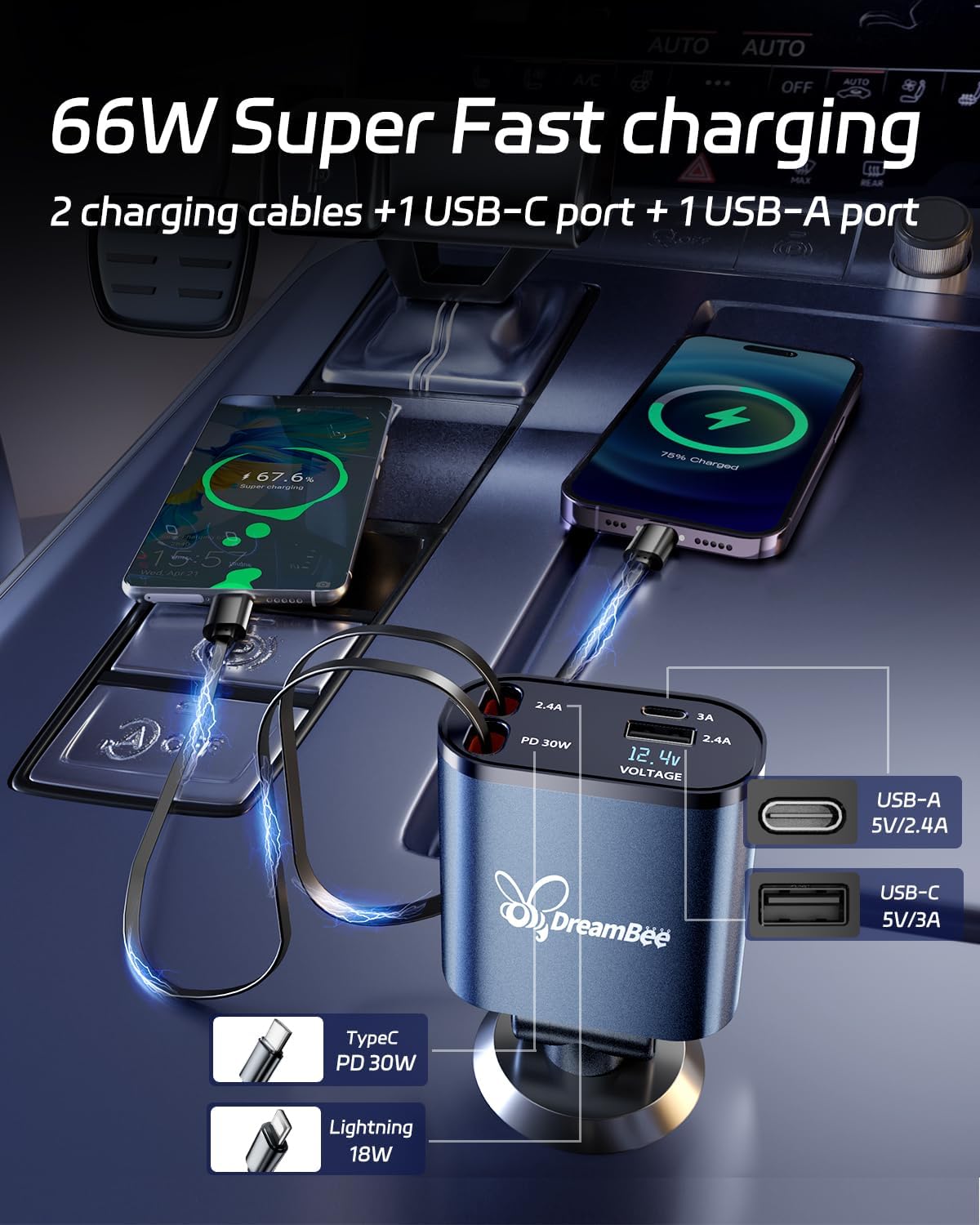 - 【Upgraded 4-in-1 Fast Charging Solution】DreamBee car charger comes with a true PD30W fast-charging Type-C retractable cable, an 18W fast-charging IOS retractable cable, and additional USB-C and USB-A ports for fast charging up to four devices simultaneously. No need for multiple chargers, just one compact device for all your charging needs