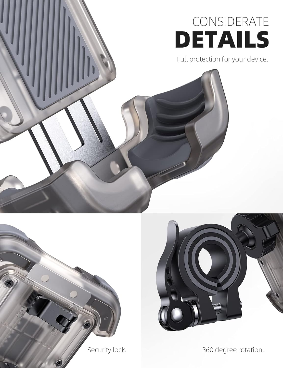- 【 Sturdy and Safe】 This motorcycle & bike phone holder grips each corner of your phone tightly and on the back of the phone clamp with a safe switch can lock the clamp. It ensures the safety of your cell phone attached to the bike handlebar even on a bumpy road.