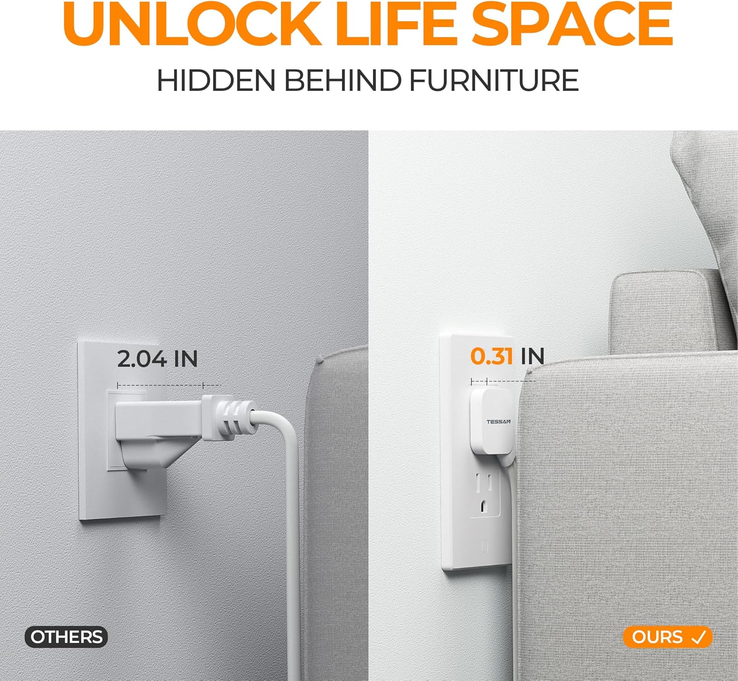 - Flat Extension Cord: With only 0.31 in ultra thin flat head design, flat small power strip can easily fit in tight spots and hide behind desk, bed, nightstand or other furniture, sitting flush against the wall; 45 degrees right angle design provides more space for other plug below without blocking