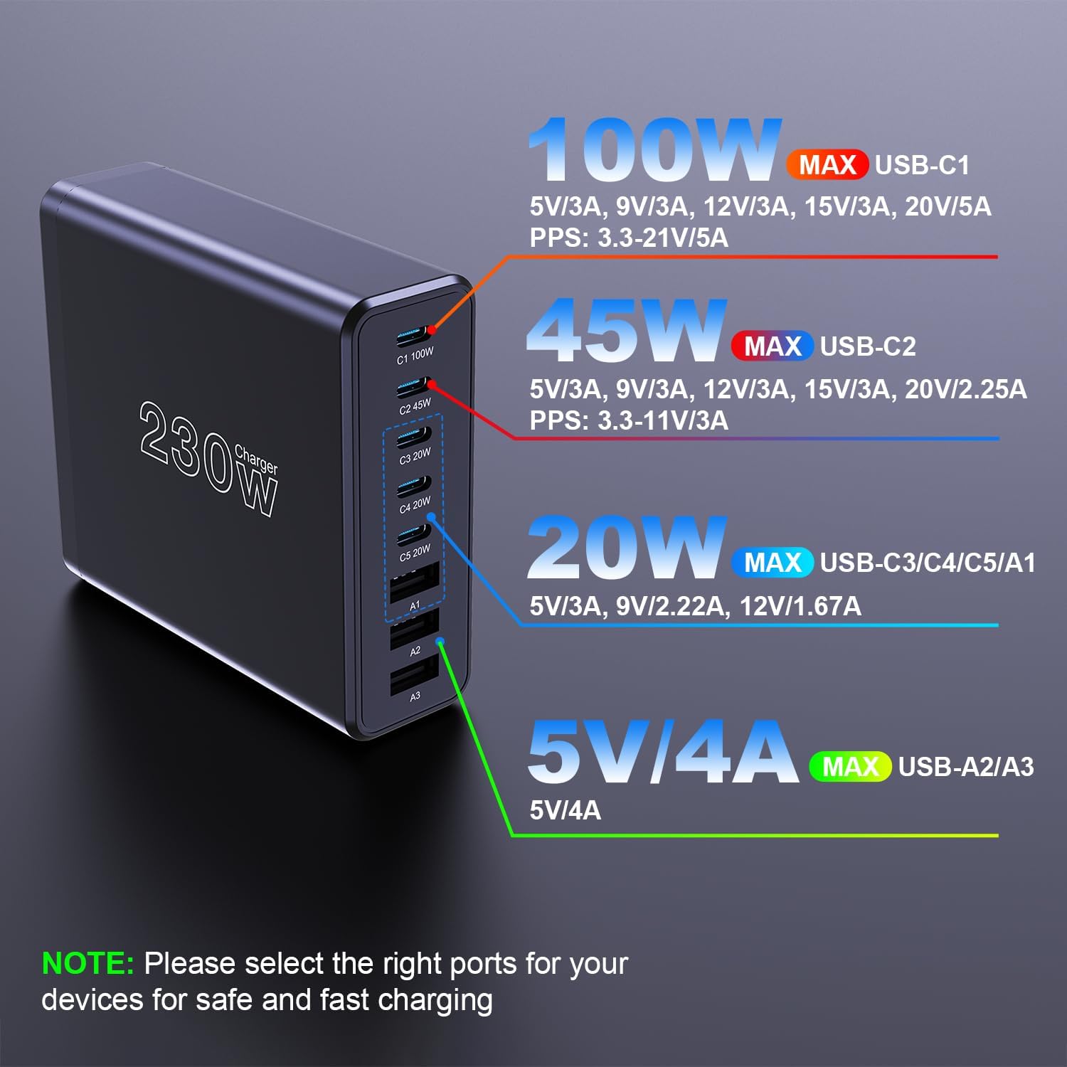 - 8-in-1 230W Super Power: Our 230W multi port charger has 5 USB-C ports and 3 USB-A ports. The USB-C1 port supports 100W, the USB-C2 port supports 45W, the USB-C3/C4/C5/A1 port supports 20W, the USB-A2/A3 port supports 5V/4A, and the total power is 230W, providing you with fast and efficient charging. Whether in the office, at home, or on a trip, it will be your better choice.