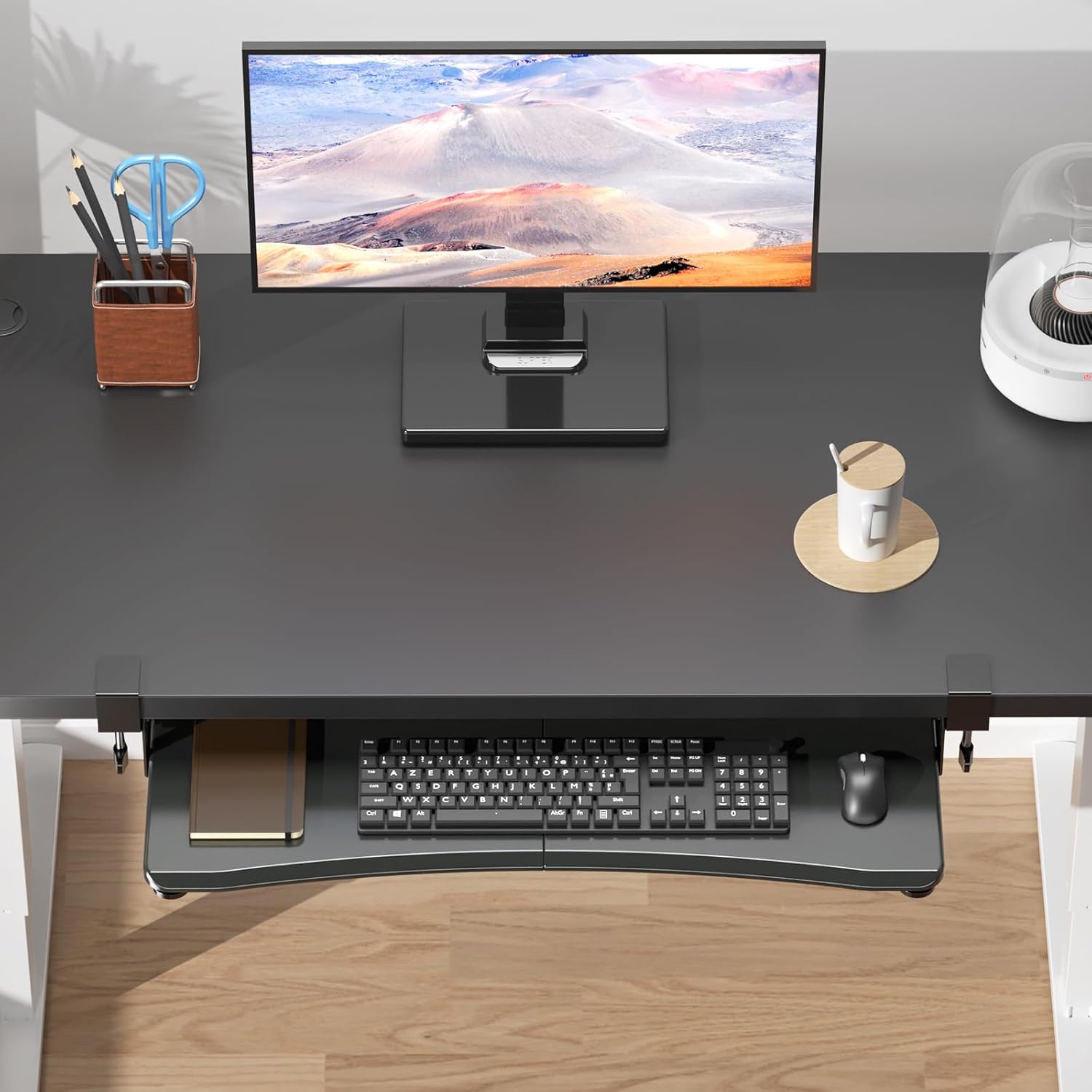 - Free up your desk - Adding an ergonomic keyboard tray to your desk can instantly free up desk space. You can easily stow the keyboard and mouse under the desk when it is not in use. An updated slide system ensures you pull and push the tray smoothly.