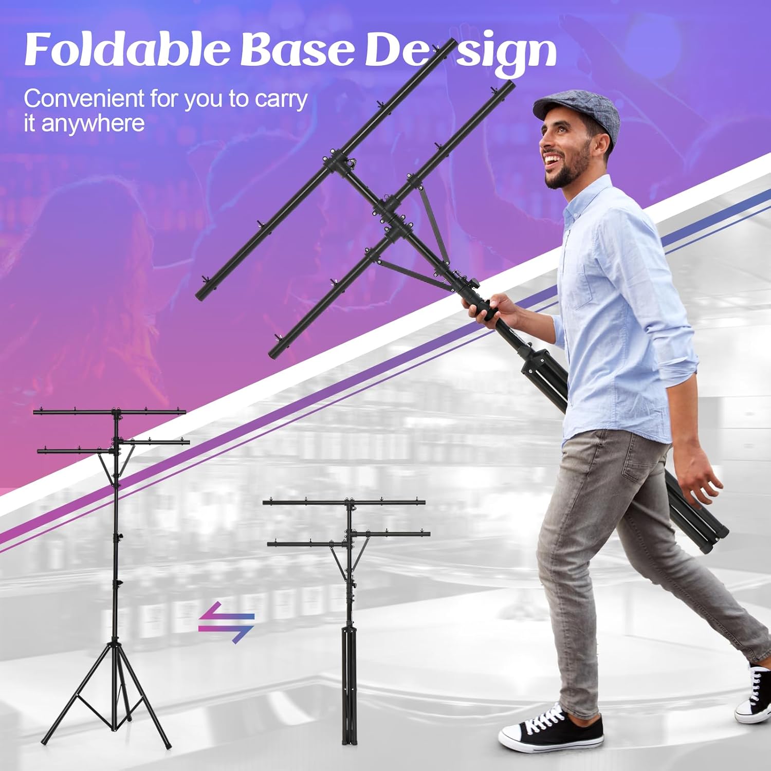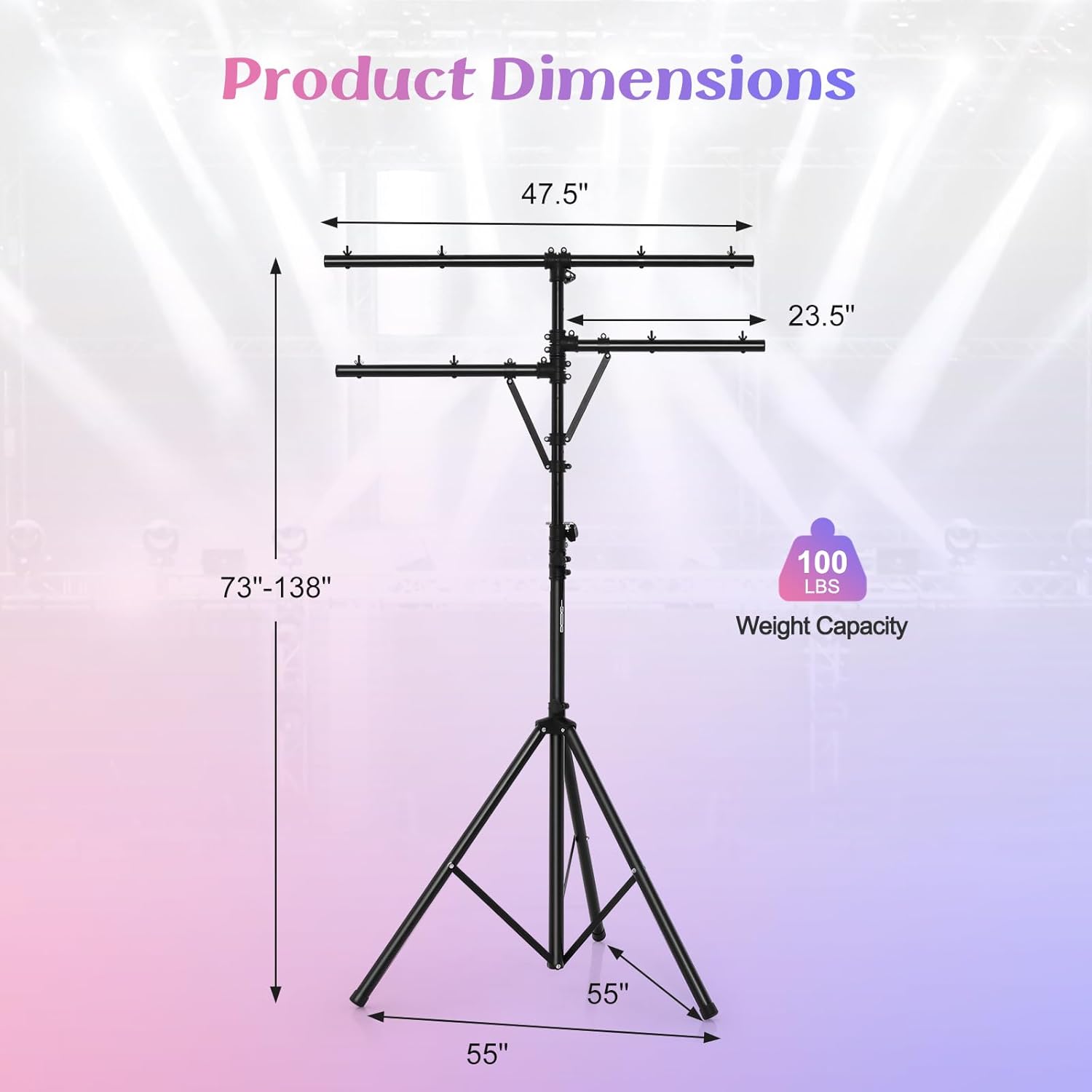 - Multi-Arm & T-Bar: This light stand comes with 2 sturdy metal arms and hanging point screws, allowing you to hold up to 8 LED par lights . You can install your lighting fixtures on this stand to meet your different lighting needs. Note: The lighting fixtures are not included.