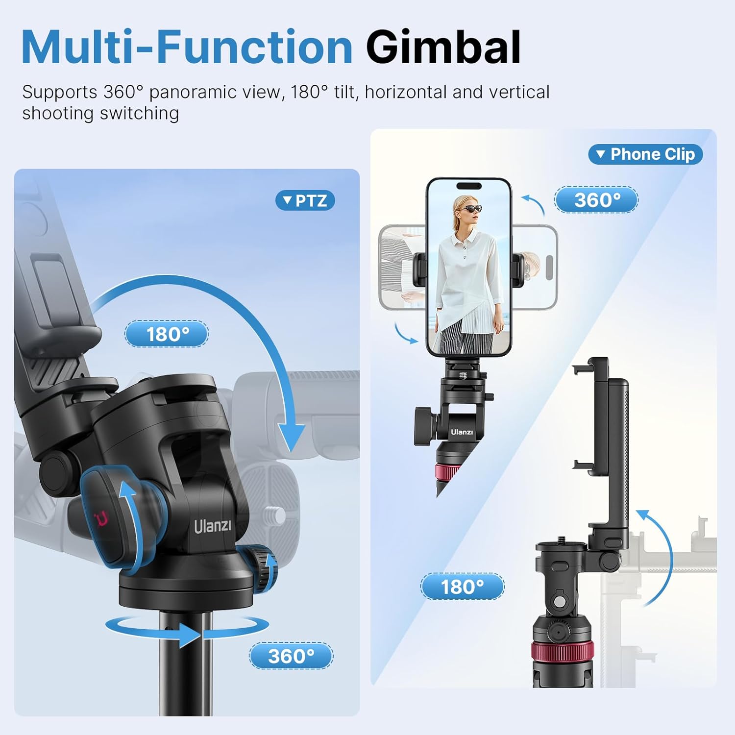 - 【360° Panoramic Ball Head & 180° Pitch Shooting】Our mobile phone and camera tripod adopts a 360-degree rotatable universal ball head design, which can adjust various shooting angles to allow you to capture the perfect shot. Tighten the knob on the ball head to lock it to a fixed angle. It also supports 180° pitch shooting, and can switch freely between horizontal and vertical shooting.