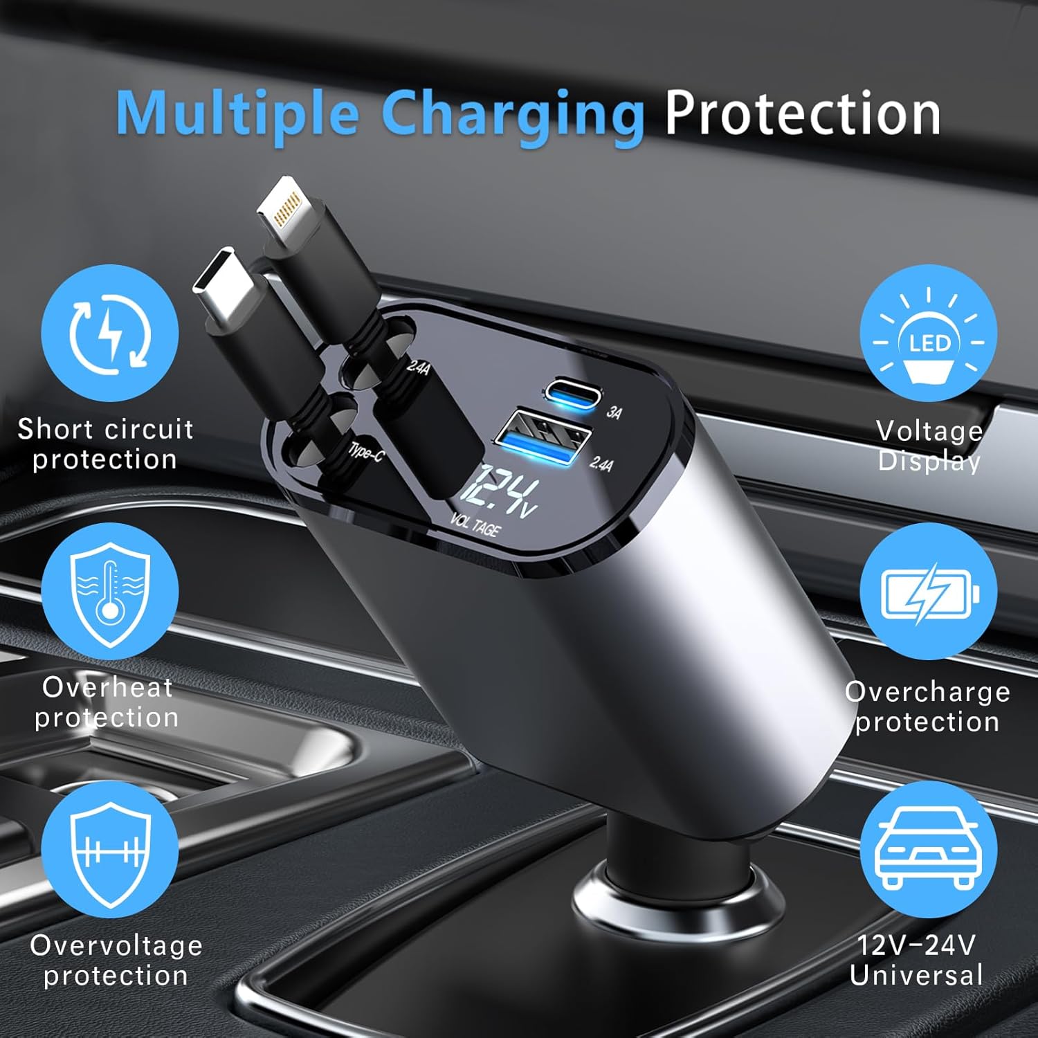 - 【4-in-1】4-in-1 car charger with 2 retractable charging cables, one is type-c and one is lightning, and there are also two USB ports