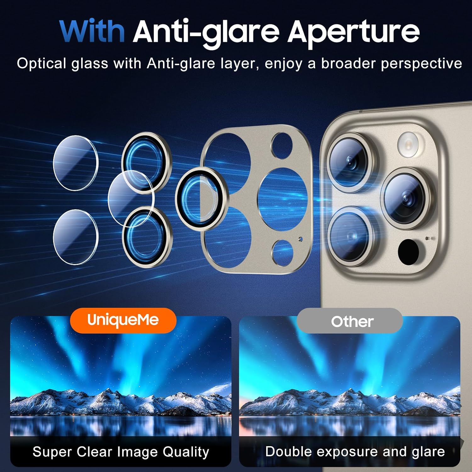 - 【4th Gen Upgraded Protection Design】UniqueMe iPhone 15 Pro / 15 Pro Max Camera Lens Protector has been designed to provide durable and effective protection for the camera lens. It has been upgraded to its 4th-Generation integrated version with Anti-glare Aperture and an Electroplated Sapphire Super Hard AF film camera protector screen.