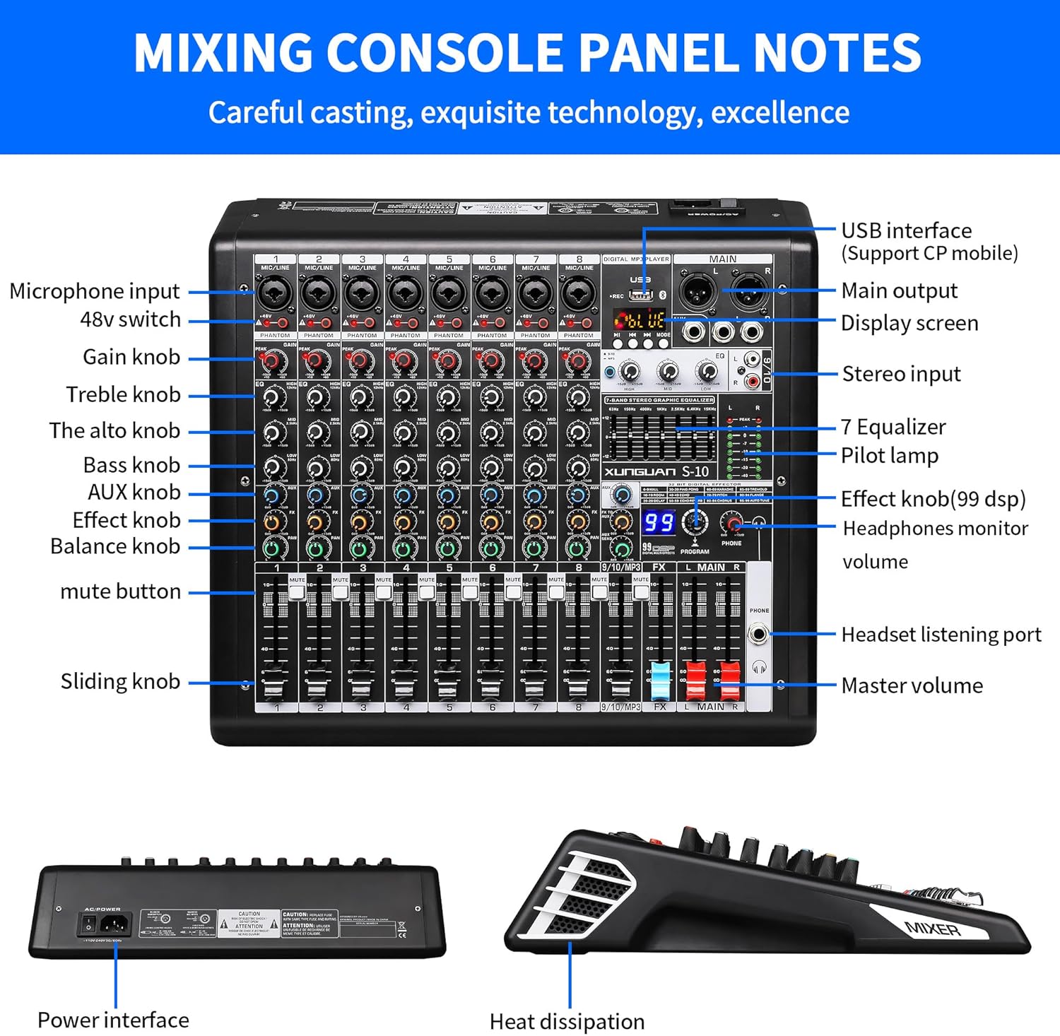S-10 Audio Mixer 10 channel 8 channel Professional DJ Mixing Console with Reverb MP3 Player Bluetooth 48V Phantom Power Supply USB Recording for Studio Karaoke Live Music