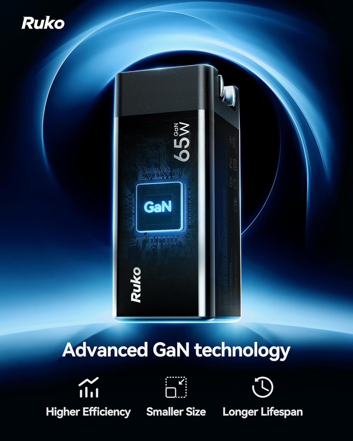 Ruko PD65W USB C Charger, 3-Port GaN Fast Charger Block, Compact Foldable Wall Charger for iPhone 16/15, MacBook Pro/Air, Galaxy S24, Pixel, Drone, Switch and More, Black