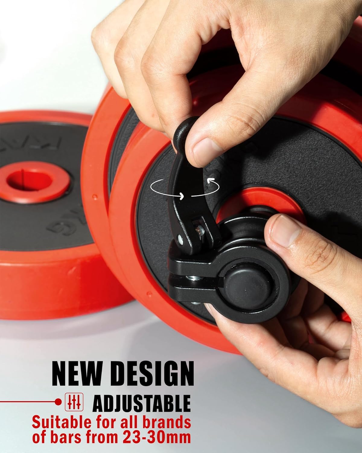 - Wide Size Adjustment Range:Adjustable barbell clamps fit 0.9-1.18inch bars with precise millimeter control. Self-tightening mechanism ensures secure grip that won't loosen over time during workouts.