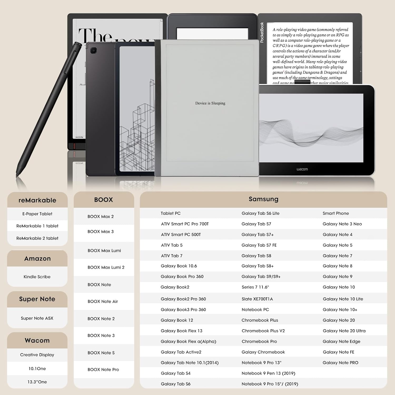 - Stylus Pen with Magnetic Design: Our stylus for remarkable 2 pen has a magnetic attraction function, which allows you to attach it to your electronic devices when you are not using them without worrying about losing them. Our EMR stylus pen has wide compatibility and is compatible with most electronic devices, like reMarkable 2/1/Kindle/BOOX/Samsung/Lenovo/HP/Galaxy models. The EMR stylus is not compatible with Apple devices