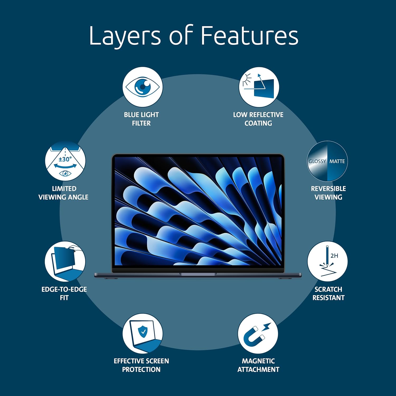 - Reversible with matte and glossy viewing options; reduces harmful Blue light by up to 22%; webcam notch