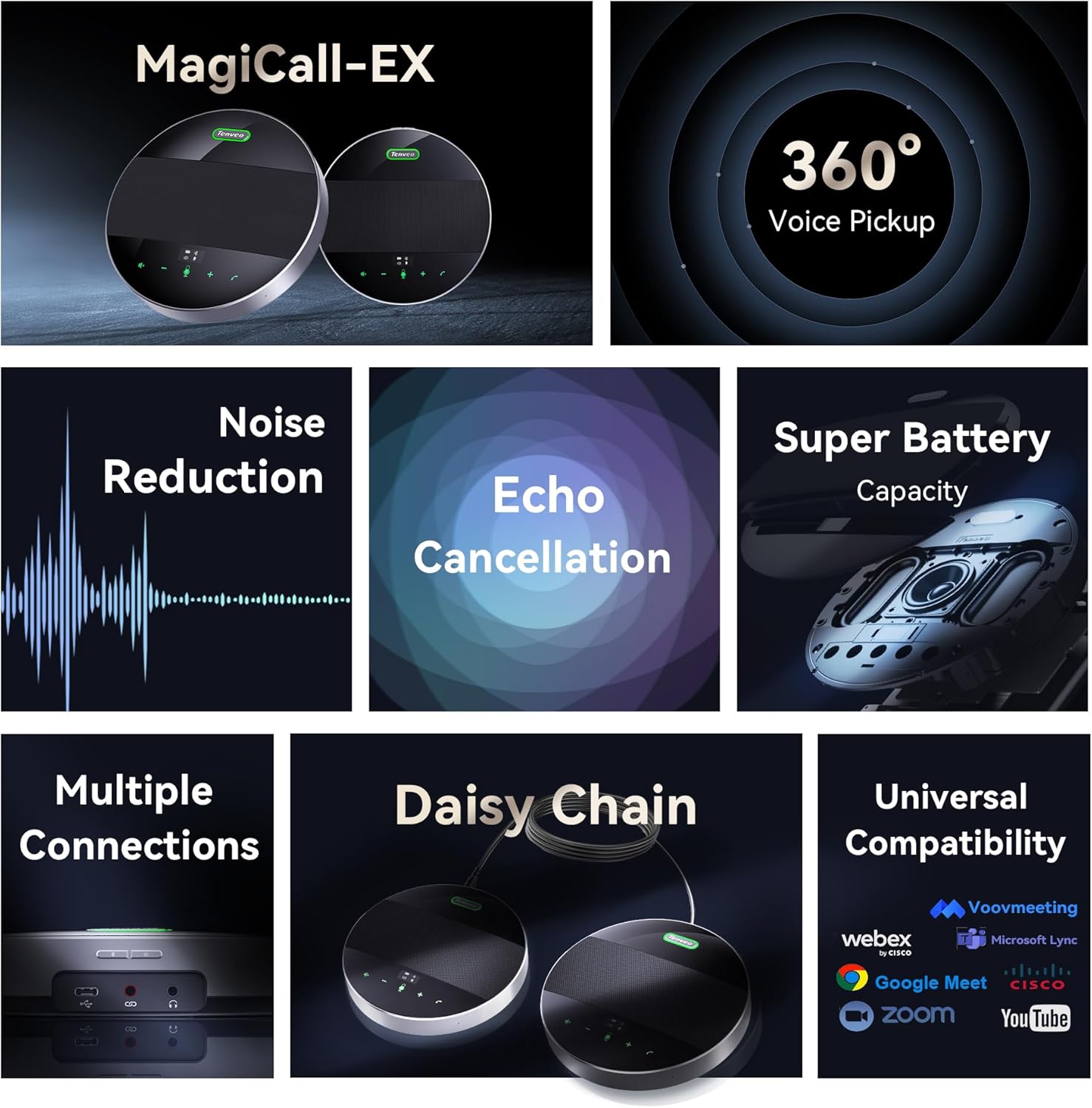 - 🌟【Daisy Chain/Use Alone Ideal for Medium/Large Meeting】Tenveo MagiCall-EX Bluetooth Conference Speakerphone features daisy chain function, cascading 2 conference speakers greatly expand your effective meeting space, delivering superb audio for collaborative conference, supporting meetings of up to 30 attendees. Meanwhile, you can not only take MagiCall-EX to a larger meeting, letting more attendees participate in the conference call, but use alone for 2 small rooms as two MagiCall speakers.