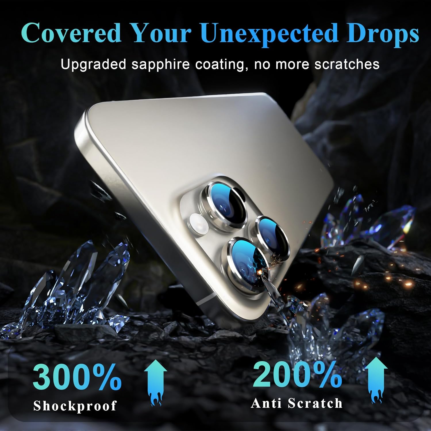 - Enhanced Shockproof and Anti-scratch: Chemically enhanced 12 layers of electroplated sapphire 9H tempered glass will not break and crack in the face of super-strong foreign object impact, and even hard rocks are difficult to leave scratches on its surface. Give your phone camera lens everyday protection from accidental drops and bumps. The 3th gen oleophobic technology can automatically dilute fingerprints and isolate oil, keeping the lens dry and clean for a long time.