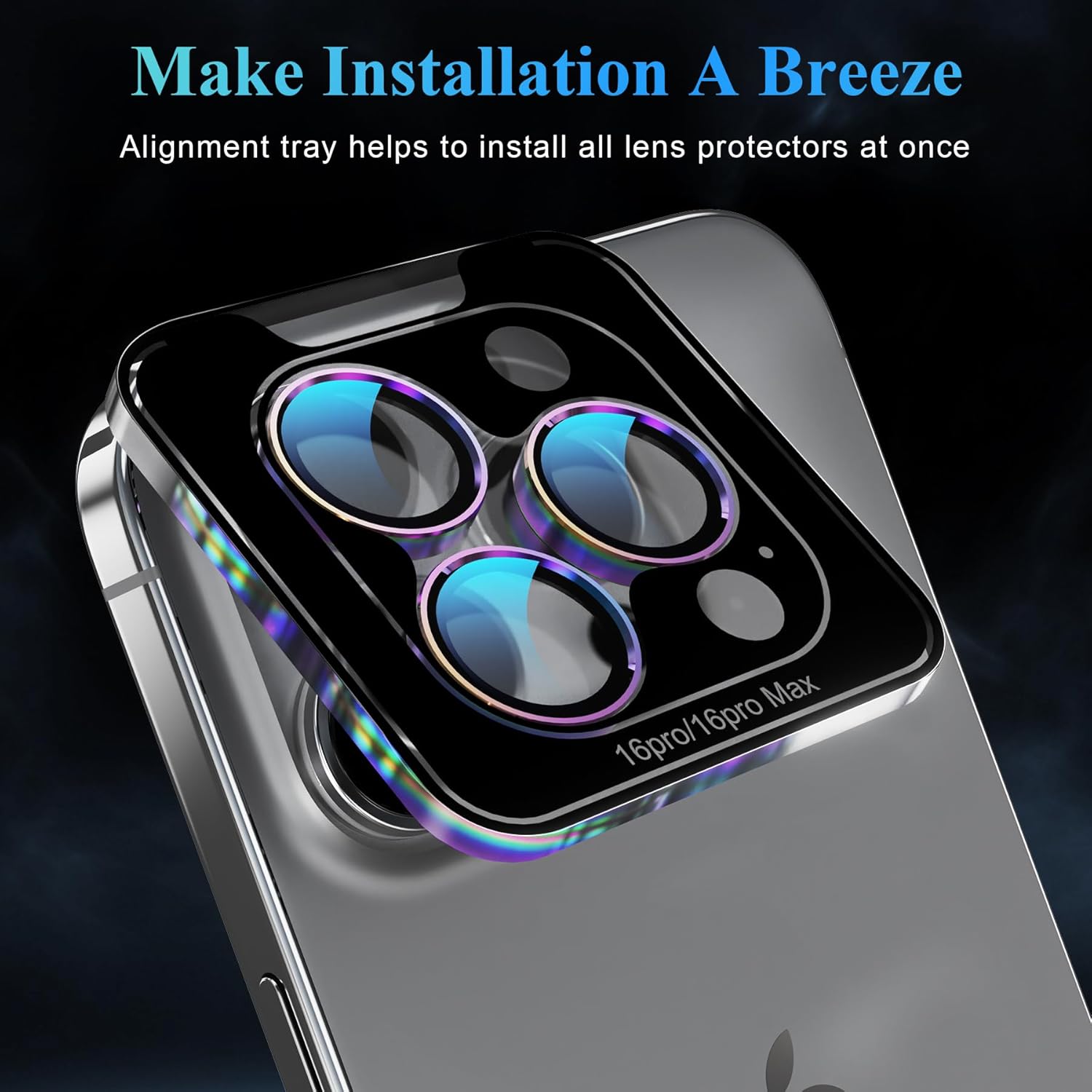 - One-step Installation: The iPhone 16 Pro camera lens protector is embedded in an acrylic positioning frame, just use our cleaning accessories to clean the lens, tear off the back protective film, align the camera lens and remove the positioning tray, the installation is done. All 3 individual camera lens covers are installed successfully at the same time, which is a very simple and considerate installation design. No bubbles and the lens cover will stick tightly for a perfect fit.