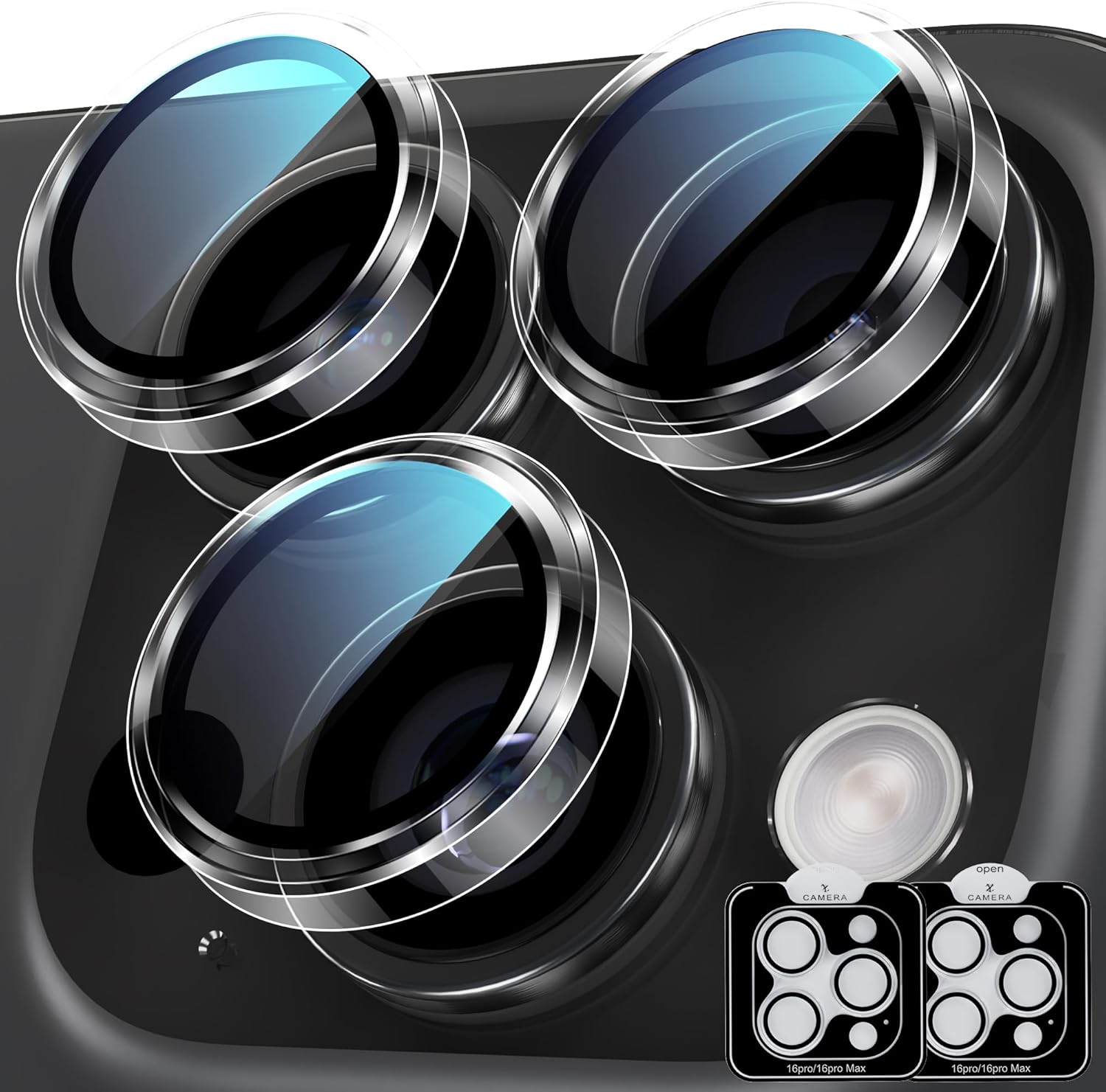 - One-step Installation: The iPhone 16 Pro camera lens protector is embedded in an acrylic positioning frame, just use our cleaning accessories to clean the lens, tear off the back protective film, align the camera lens and remove the positioning tray, the installation is done. All 3 individual camera lens covers are installed successfully at the same time, which is a very simple and considerate installation design. No bubbles and the lens cover will stick tightly for a perfect fit.