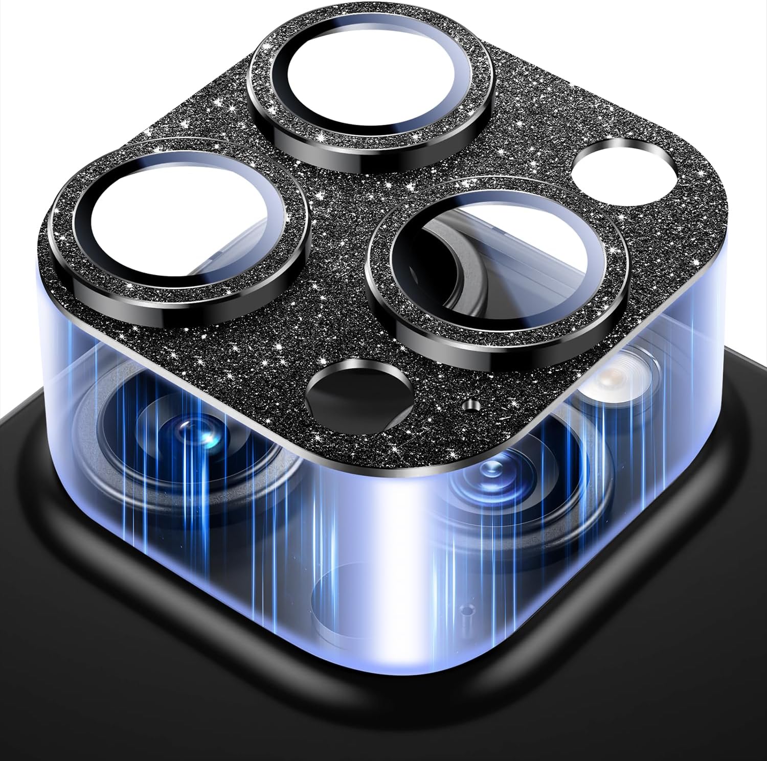 Uyiton Compatible with iPhone 16 Pro/iPhone 16 Pro Max Camera Lens Protector - [Not Easy to Break][Strong Adsorption][Case-Friendly] Metal Tempered Glass Rear Camera Screen Cover - Glitter Black