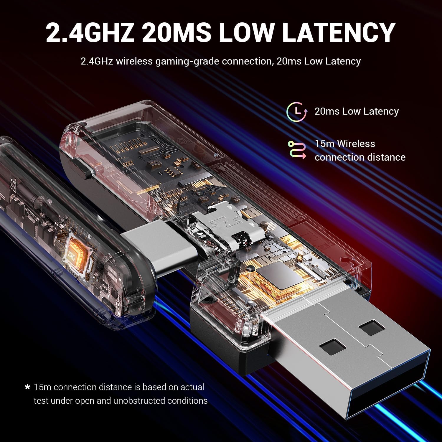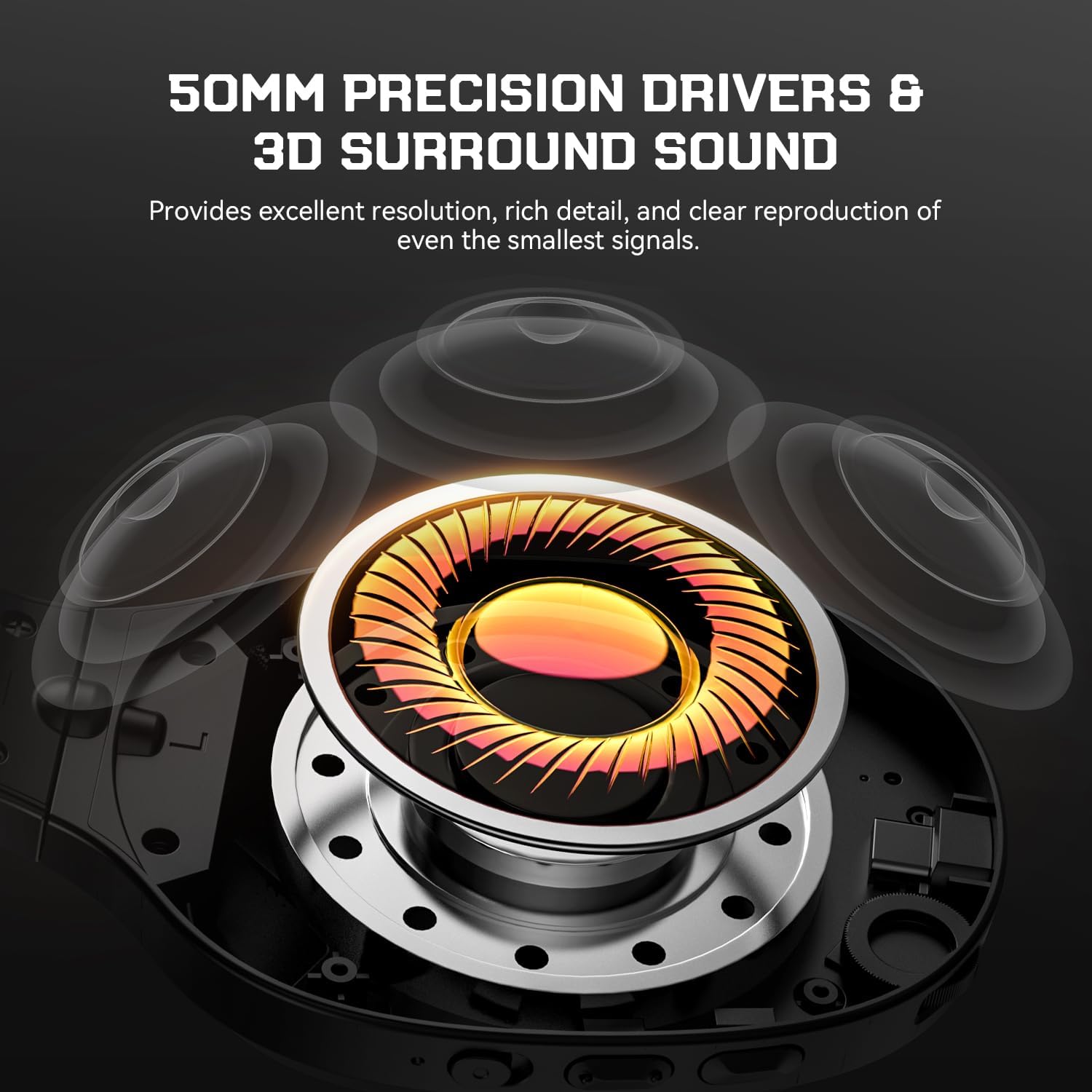 - Stable Connection & 3D Stereo Sound: E5BT wireless gaming headset combines high performance 2.4GHz lossless wireless technology for the accessible connection up to 49 feet in an unobstructed space. Lower latency (≤20ms) and featuring 50mm driver with 33% extra sound effect ensure that the wireless gaming headphones provide higher quality stereo sound, which makes you sense voice of directions, footsteps and every details clearly in games for a better immersive gaming experien