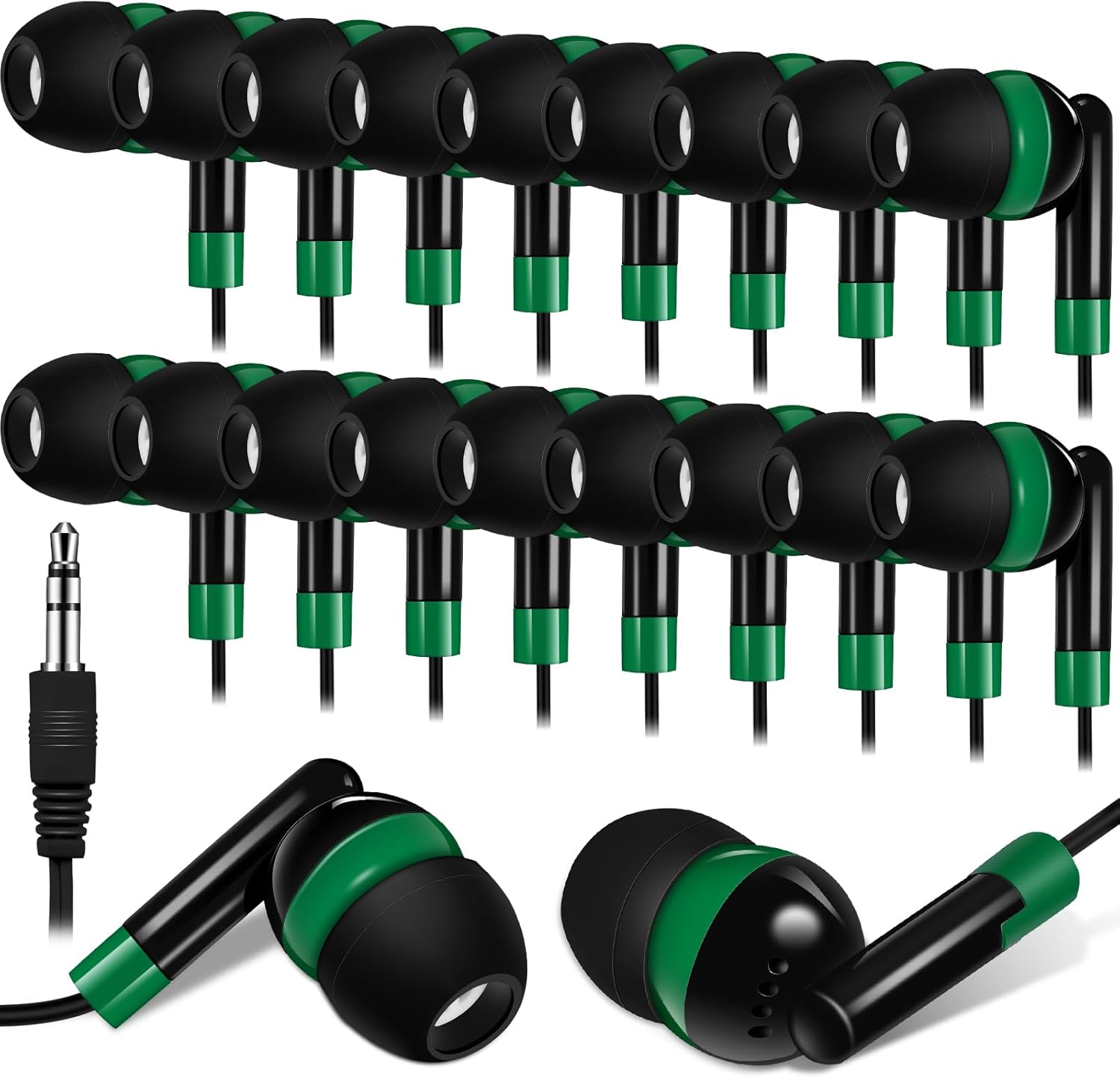 Kanayu 100 Pack Wired Earbuds Bulk for Classroom Ear Headphones Wired Basic Student Earbuds No Microphone with 3.5mm Jack for Kids Class Laptop School Library, Individually Bagged(Green)
