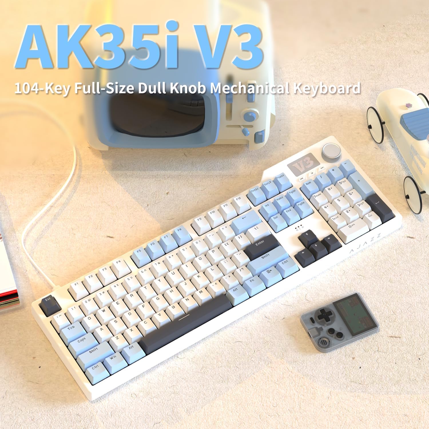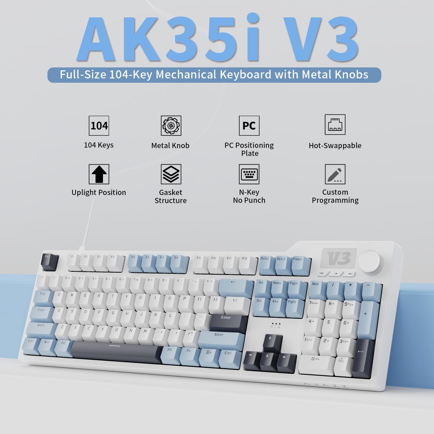 AJAZZ AK35I V3 104-Key Full Size Wired Gasket Mount Gaming Keyboard with Multimedia Buttons & Knob Control | Five Layer Pad | OEM Profile PBT Keycaps | Blue Backlit Custom Keyboard