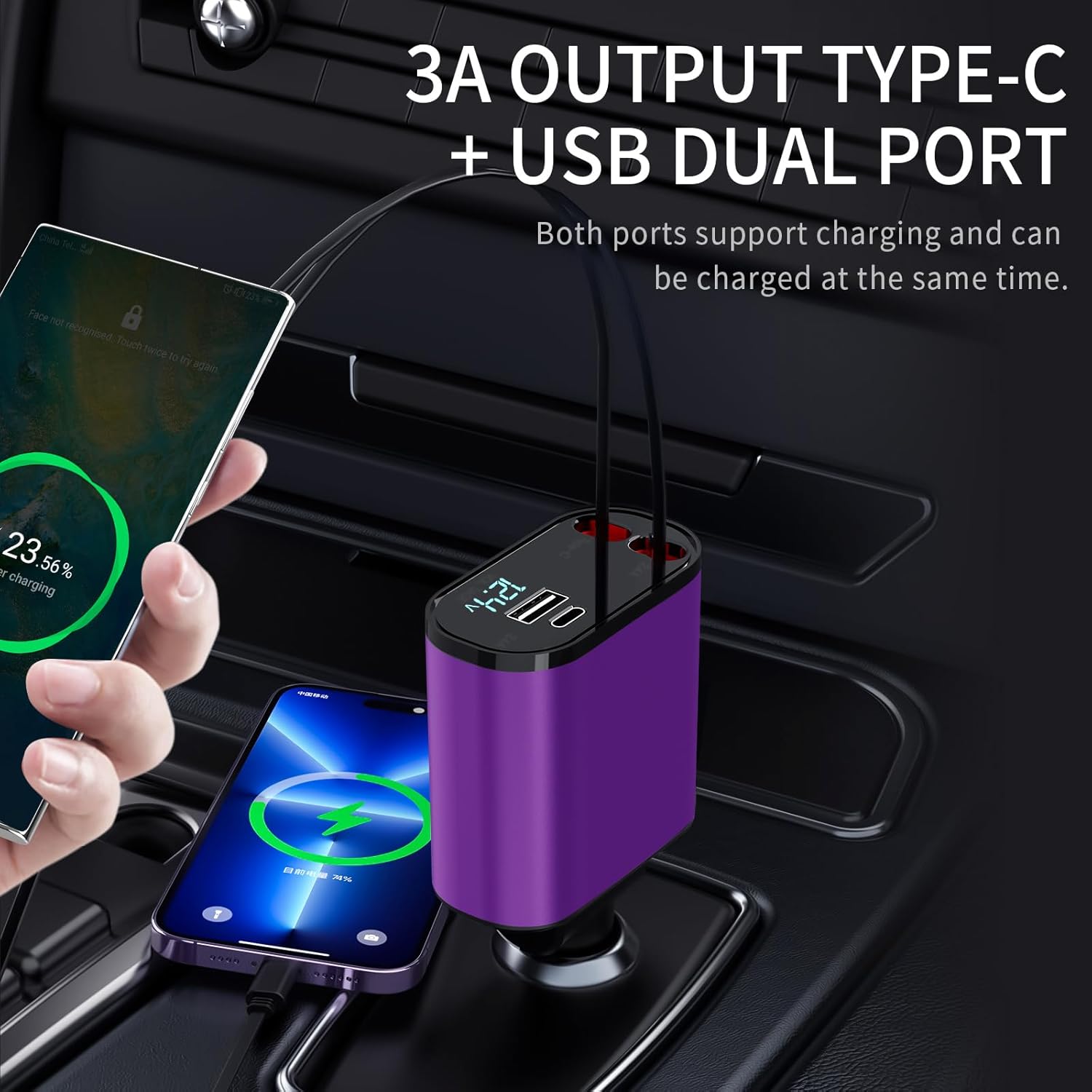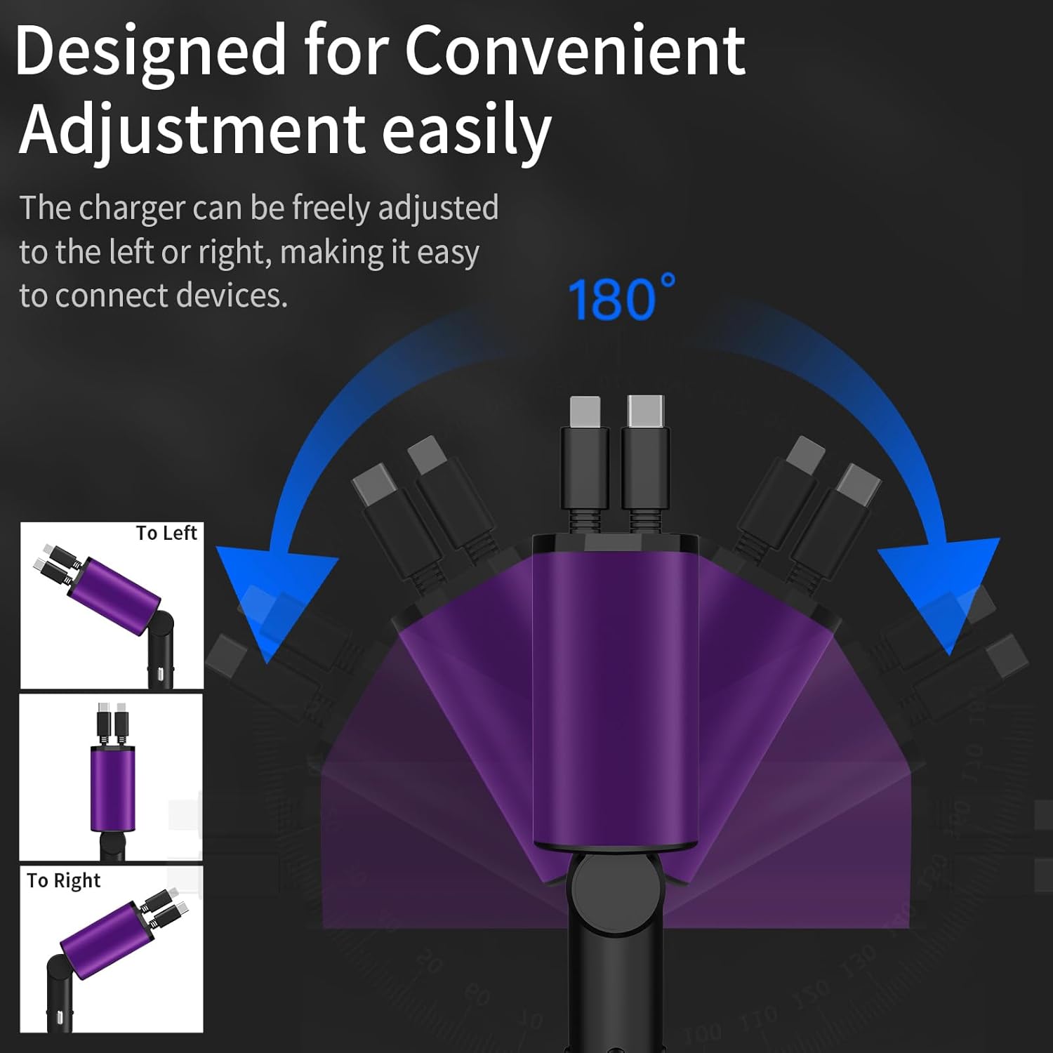 - [Flexible Retractable Car Charger] This 4 in 1 retractable car charger allows you to pull out the cable within a range of 80cm(2.6ft) for use, and our iphone car charger retracts back automatically for safe and tidy storage without any cable entanglement. This convenient design of this iphone 15 car charger facilitates easy and practical charging control and usage experience.