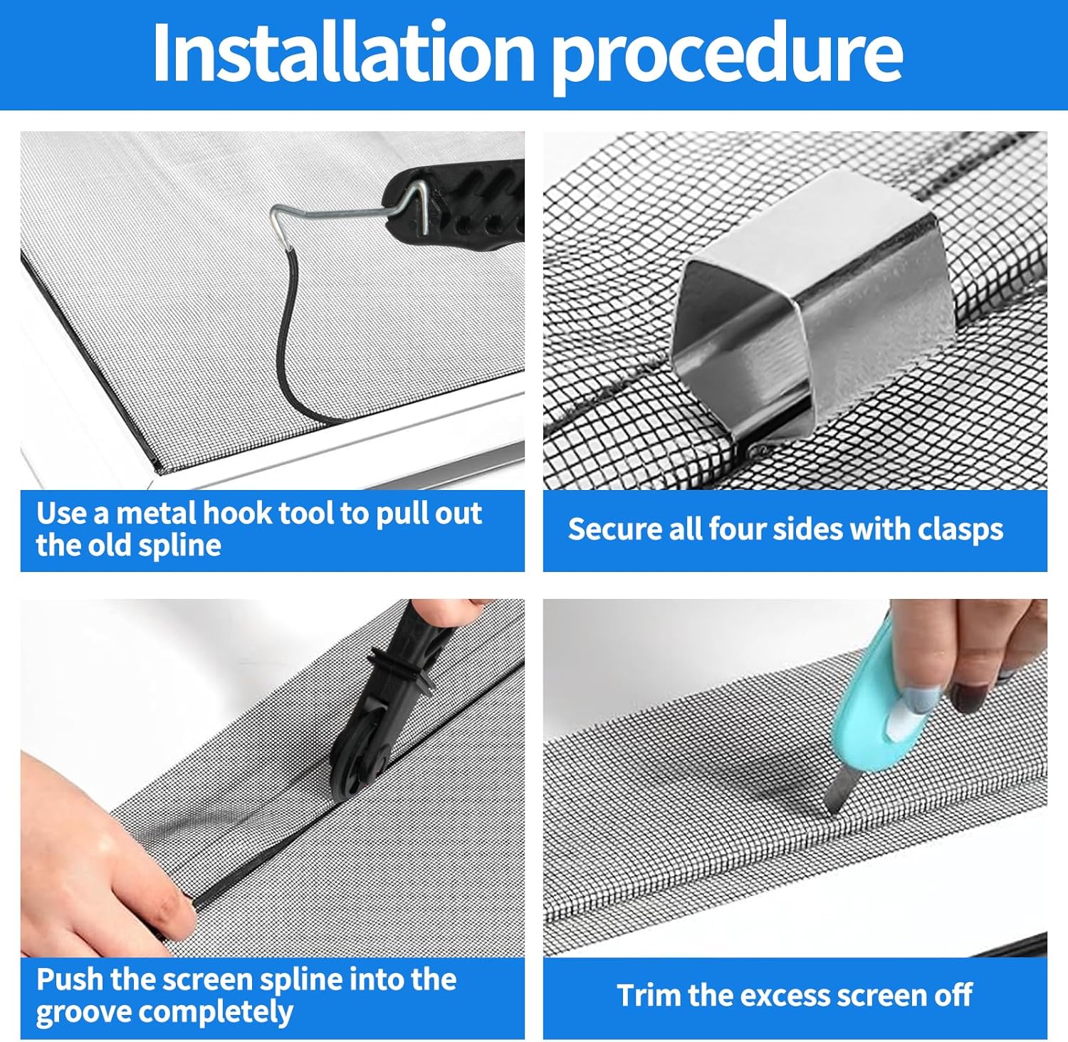 - Complete Screen Replacement Kit: Window screen repair kit have all the tool you need, 48" x 118" screen mesh, 39ft screen retainer spline, screen roller tool, spline removal hook, 8pcs window screen installer clips, Ruler and window screen cutter(random color).