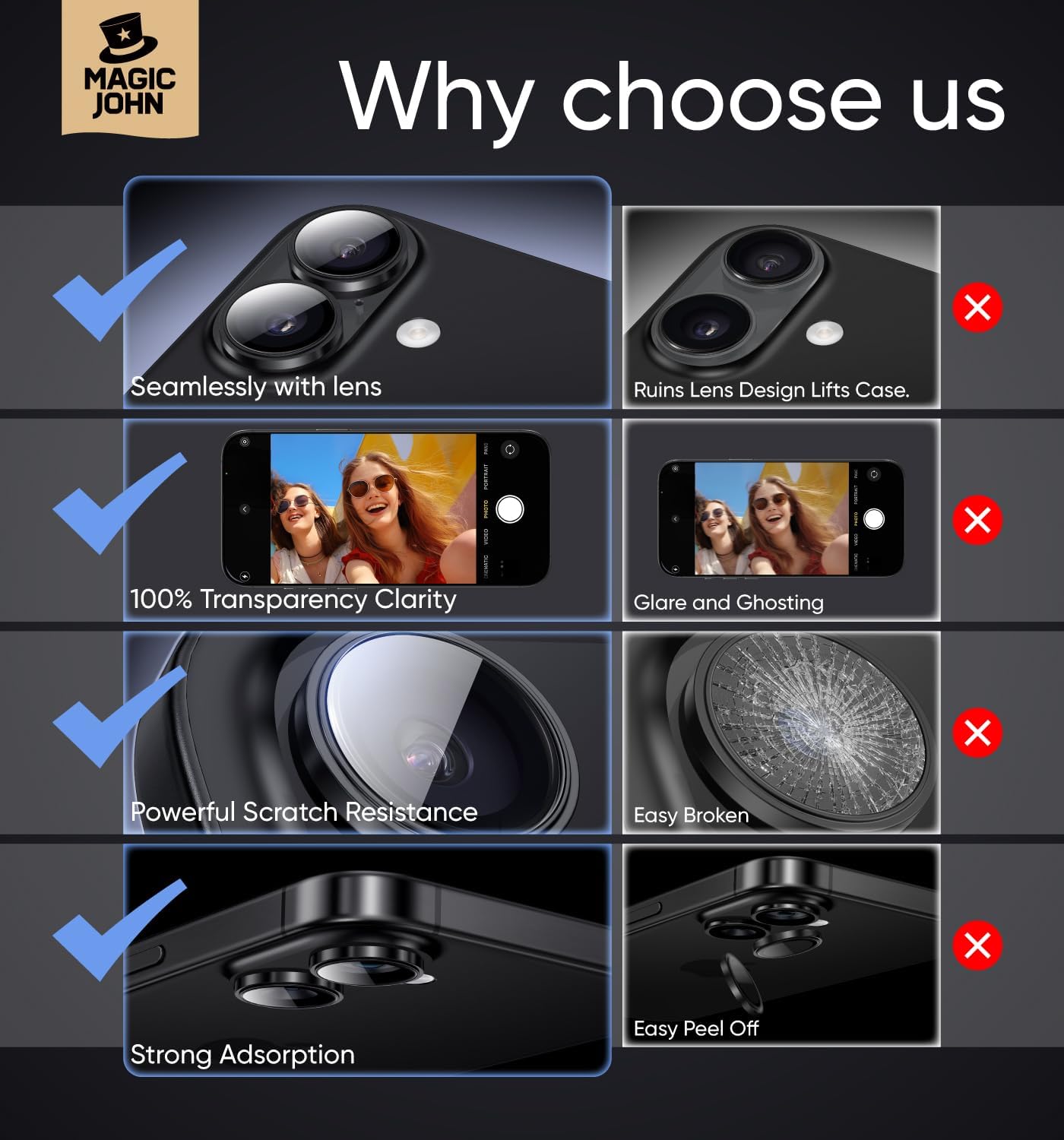 - [High-reduction Photography] MAGIC JOHN camera lens protector with upgraded sapphire material, 99.99% optical-grade light transmittance, AR anti-reflection technology which produces the same shooting results as the original iPhone 16/16plus camera.