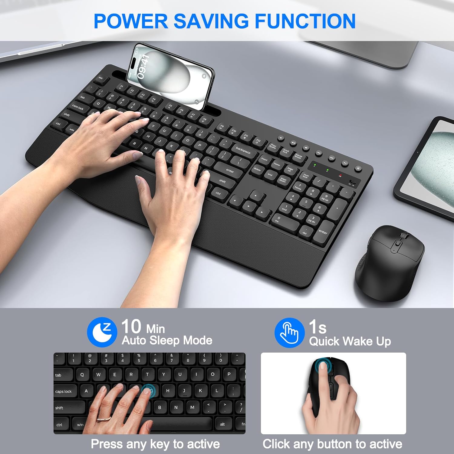 EDJO Wireless Keyboard and Mouse Combo, Full-Size Ergonomic Wireless Computer Keyboard with Wrist Rest, Phone Holder, Sleep Mode, Comfortable Natural Typing Set for Windows, Laptop, Mac, PC
