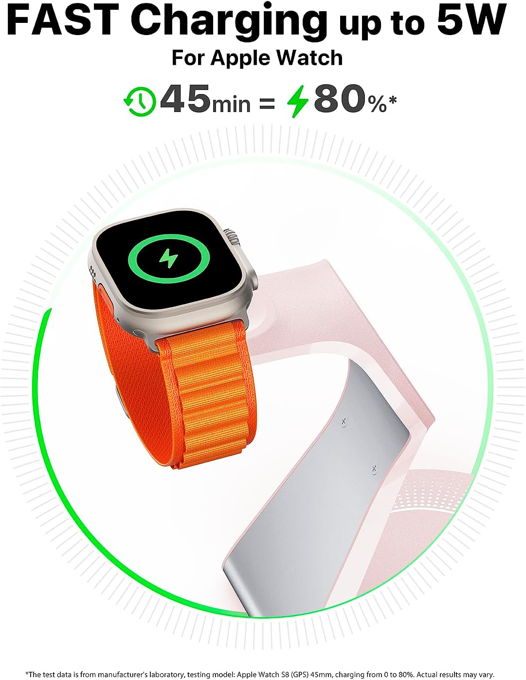 - Fast Charging for Apple Watch: Up to 5W Apple Watch charger. Charge Apple Watch 9 up to 80% in just 45 min—ideal for a fast charge before bed, ensuring it's ready to monitor your sleep all night