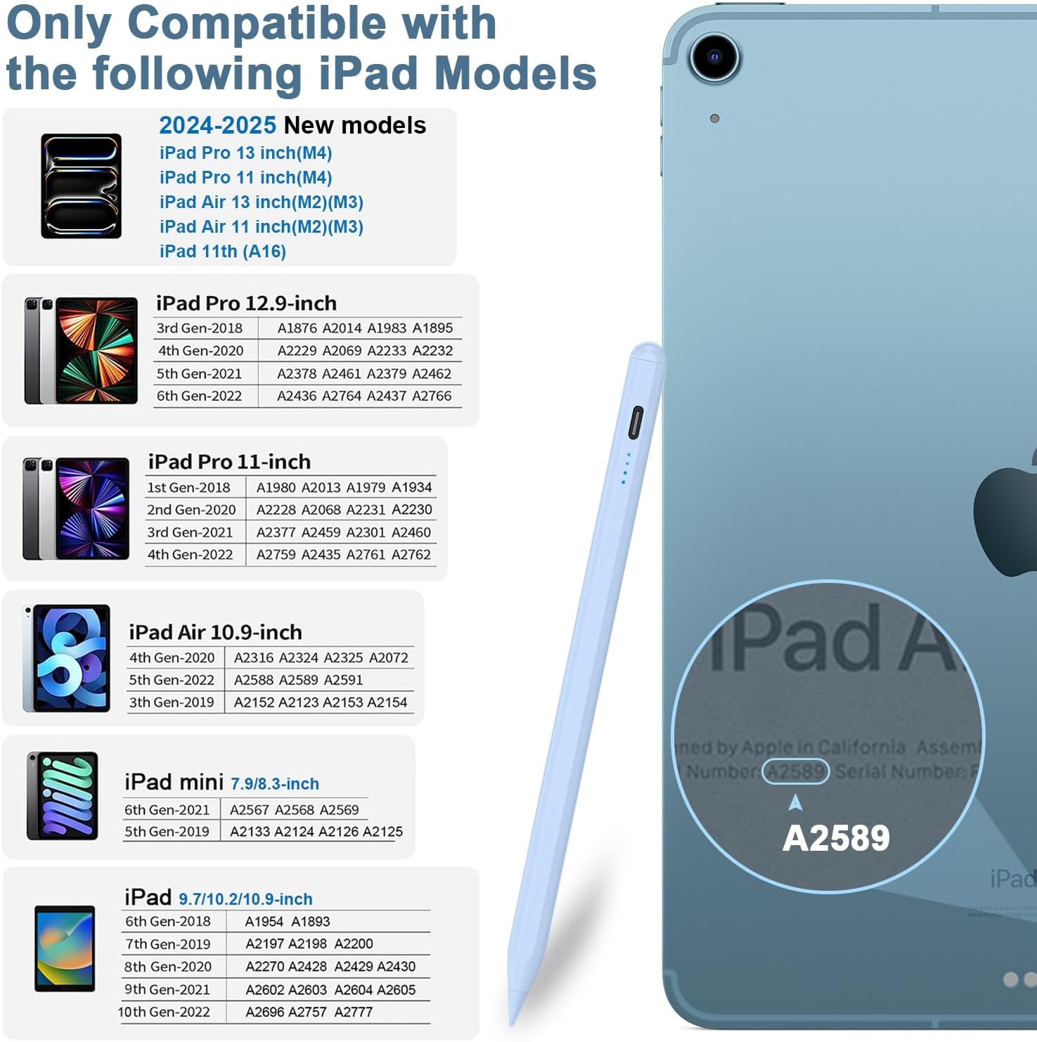 Stylus Pen for iPad 9th&10th - Type-c Charging Pencil for ipad Palm Rejection Active Pen Compatible with (2018-2025) Apple iPad 6/7/8/9/10/11(A16), Air 3/4/5/M2/M3, Mini 5/6, Pro 11"/12.9"/M4(Blue)