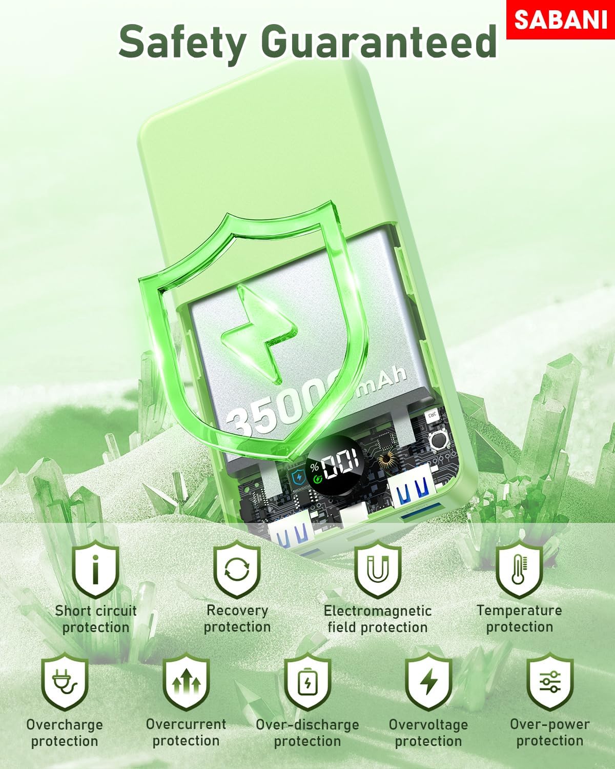 - Safe and Reliable Battery Pack: SABANI portable battery has 10 layers of multiple system protection, built-in low-temperature IC ice core, intelligent monitoring of voltage and current, actively avoid over-charge, over-discharge, short circuit, high temperature and a series of potential dangers, creating a safe charging environment for you. What You Get: 1*35000mAh Portable Charger with 4 built-in Cables and 3 Ports, 1*USB C Cable for Recharging Portable Charger, 1*User Manual.