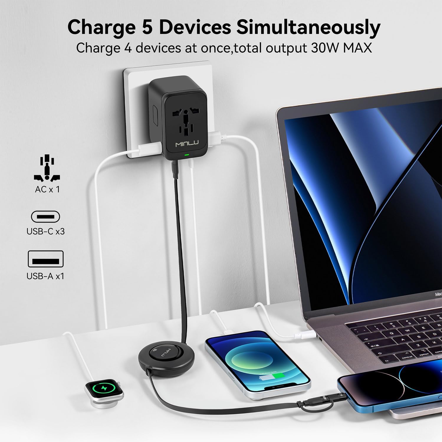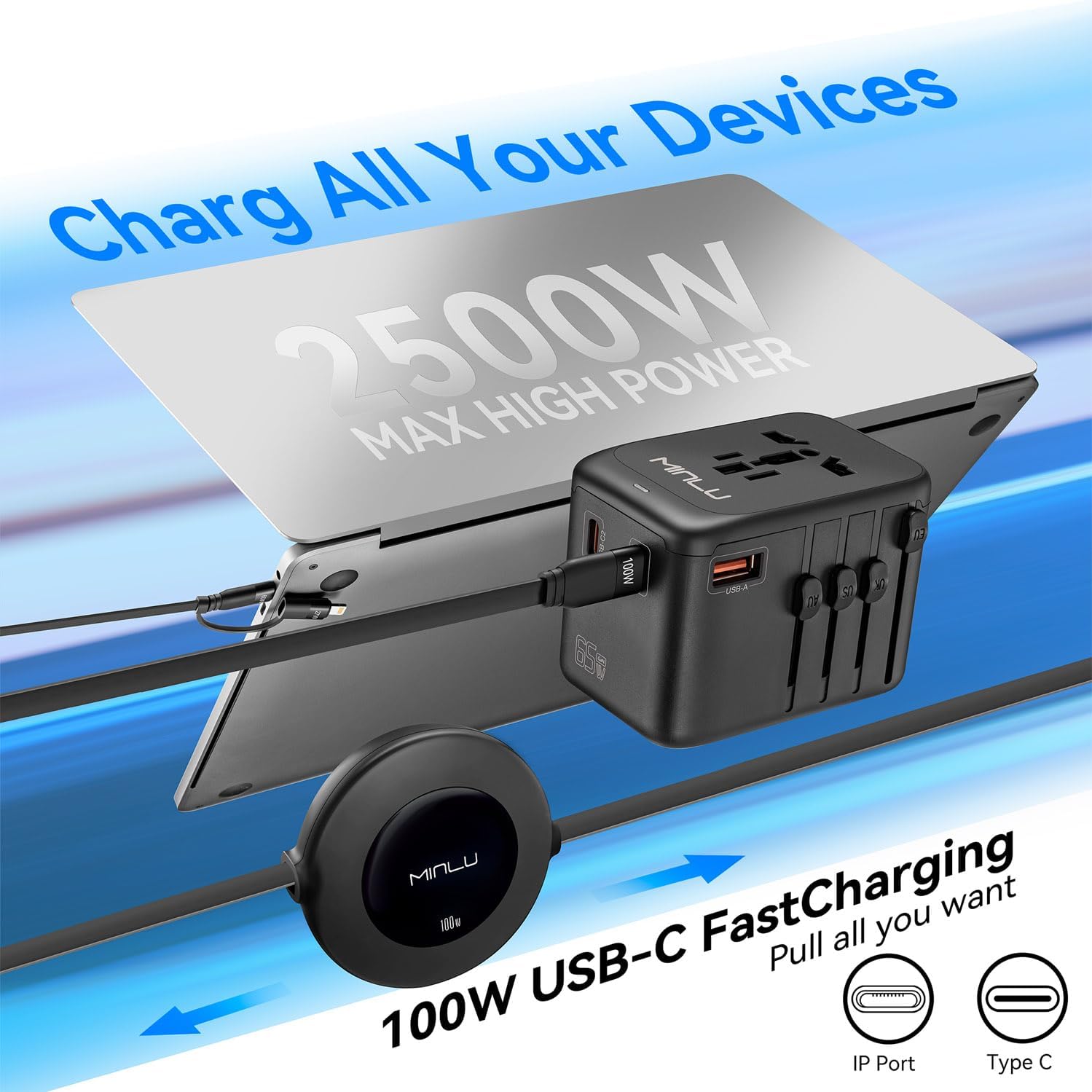 - ăWhat You Getă: 65W Universal Travel Adapter with 3-in-1 3.3 ft (PD 100W) retractable USB-C to USB-C/Lightning Cable. Minlu provide charging cord has a 30-day return guarantee, a 12-month worry-free warranty and a 7*24 friendly service. If you have any doubts, please contact our service team as soon as possible.