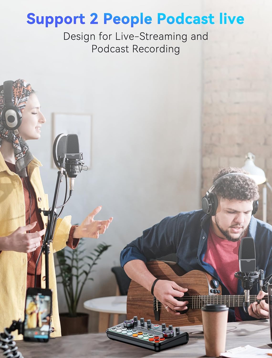 - Support for 2 People Live Streaming:This Podcast Equipment Bundle for 2 is specially designed for two people live streaming or recording. The functions on the audio mixer can fully meet the needs of daily live broadcasting. Equipped with 2 condenser microphones, 2 Double-Layer Pop Filter, 2 adjustable suspension scissor arm stand, 2 Shock mount, 2 Anti-wind foam Cap, Power cable, Live sound card. You can use standing, sitting, find the best use angle for you.