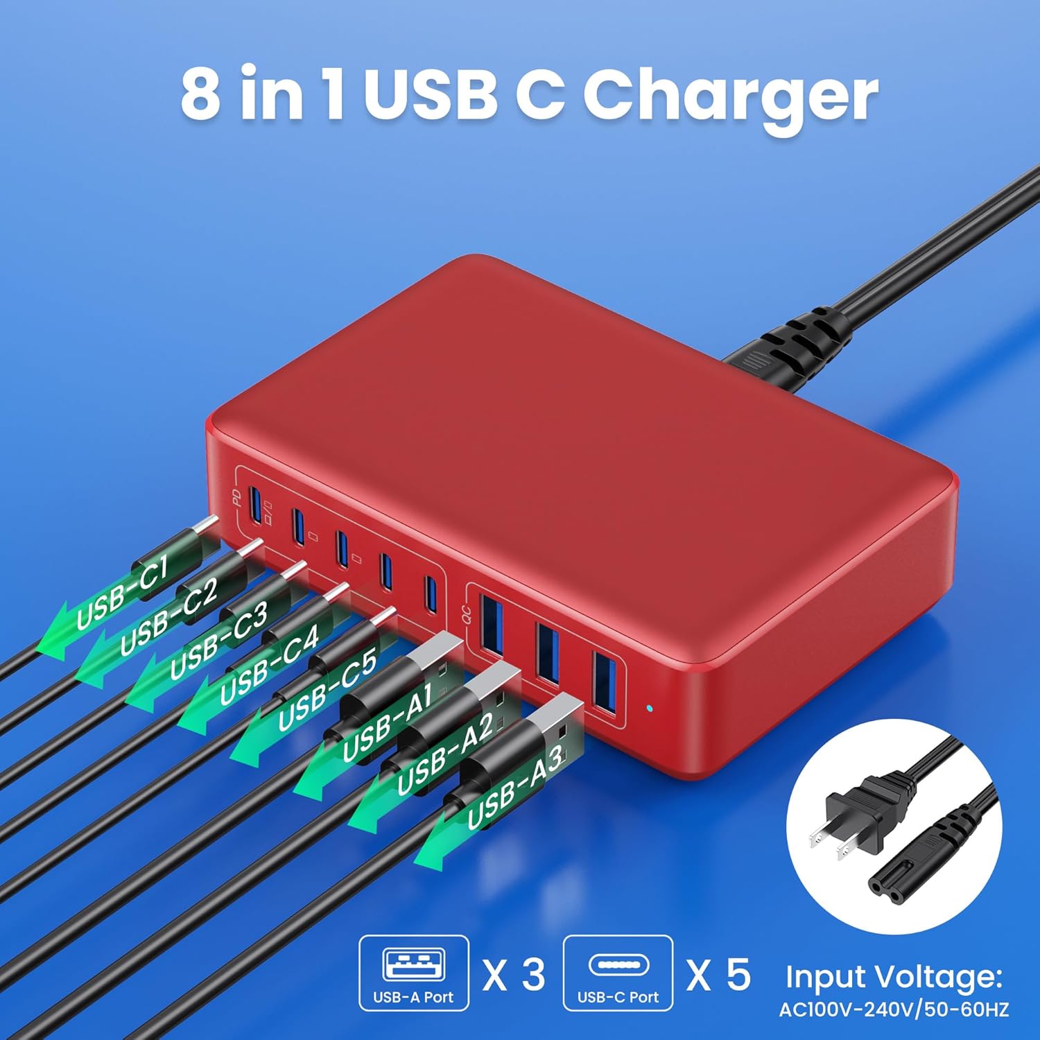 - 【300W Super Fast 8-in-1 Usb C Charger Block】Our USB charger provides multi charging options to meet your different needs. With 5*USB C ports and 3*USB A ports, no need for more adapters, you can use just one outlet to plug in laptops, tablets, smartphones, Bluetooth speakers and other small gadgets like earbuds, smartwatches, game consoles etc.Our USB C charging stations feature 8 independent output ports, ensuring all devices can charge simultaneously at full speed without power sharing and disconnection,this 8-in-1 charging station will reduce your accessories burden and help you create an organized and clean desktop.