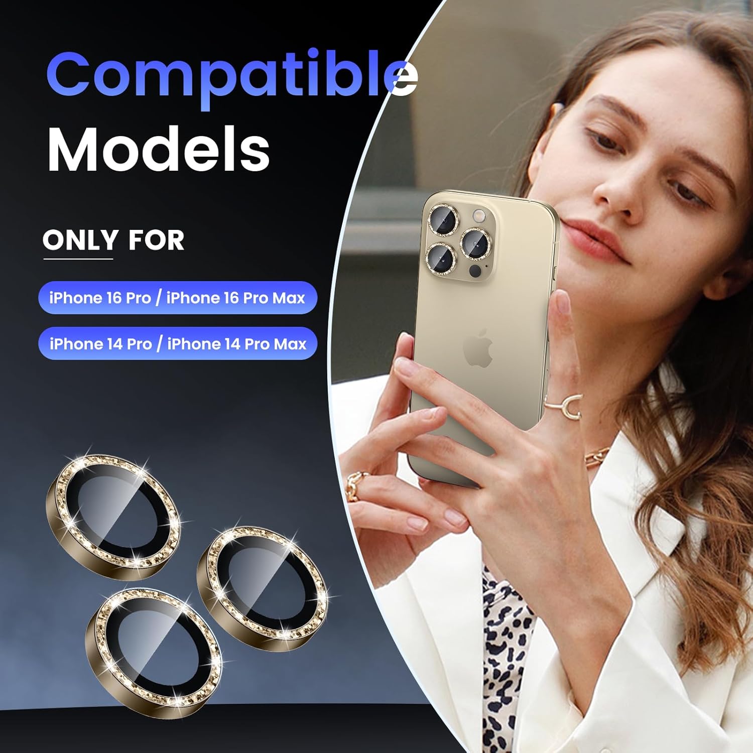 - Compatibility- Tensea rear rhinestone camera screen protector made by aviation aluminum and 9H tempered glass is designed for iPhone 16 Pro Max 6.9" / iPhone 16 Pro 6.3" / iPhone 14 Pro 6.1" / iPhone 14 Pro Max 6.7" with three camera. (Note: Not for iPhone 16/iPhone 16 Plus/iPhone 14/iPhone 14 Plus with two Camera) No bubbles, Case friendly, leave no residue after removed