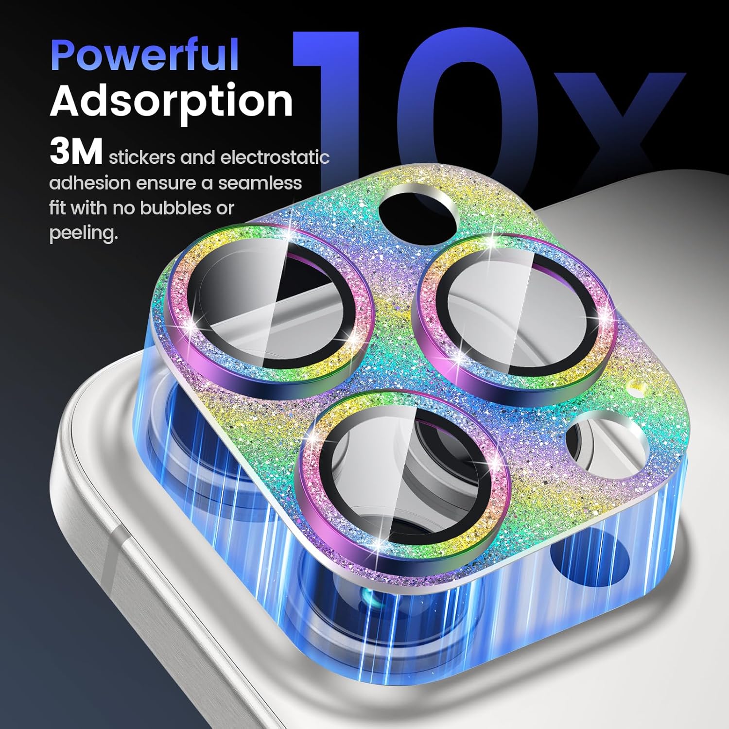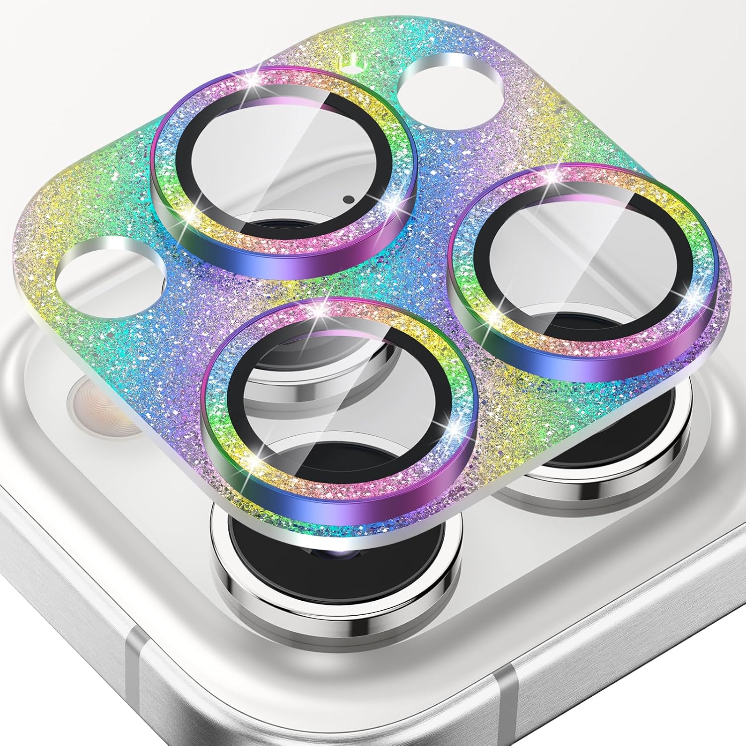 - GLITTER TEXTURE- Upgraded tempered glass camera screen protector cover built-in 3 single metal ring protector, which bling glitter reflects fascinatingly. It protects lens also makes it personalized decorations. Many colors are available for you to choose