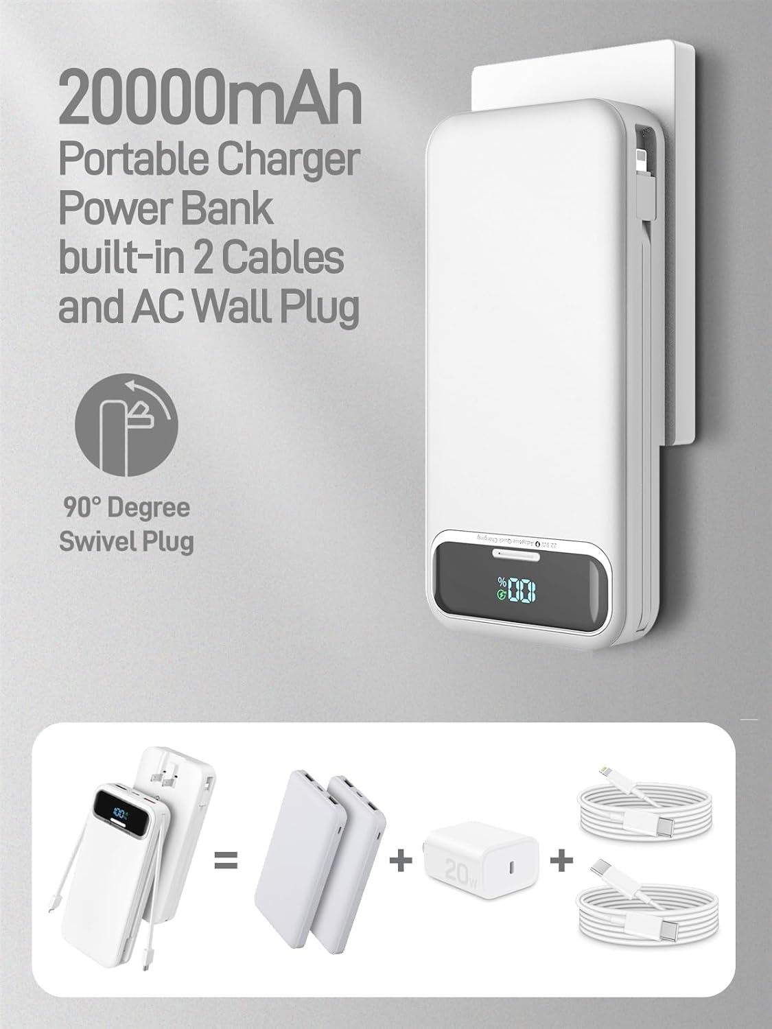 - Built-in Cables and AC Wall Plug:20000mAh portable charger built-in Type C and iOS 2 types cables,compatible with iPhone,USB C devices. Portable phone charger is built-in wall plug that charges the power bank itself directly from the wall outlet.You don't need to worry about carrying adapters and cables when travel.